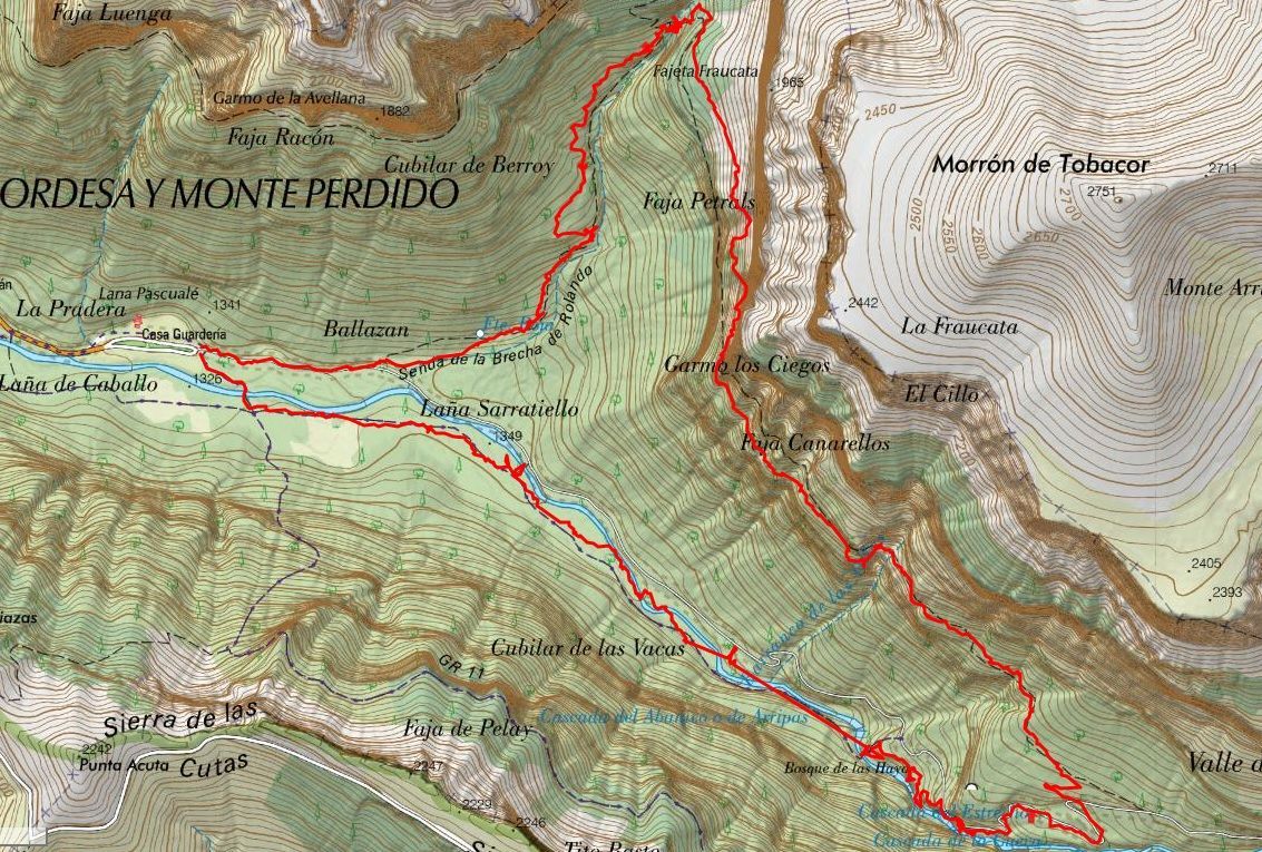 Itinerario: Pradera de Ordesa – Circo de Cotatuero – Faja Canarellos – Bosque de las hayas – Cascada del Estrecho – Cascada de la Cueva – Cascada de Arripas – Sendero accesible – Pradera de Ordesa.