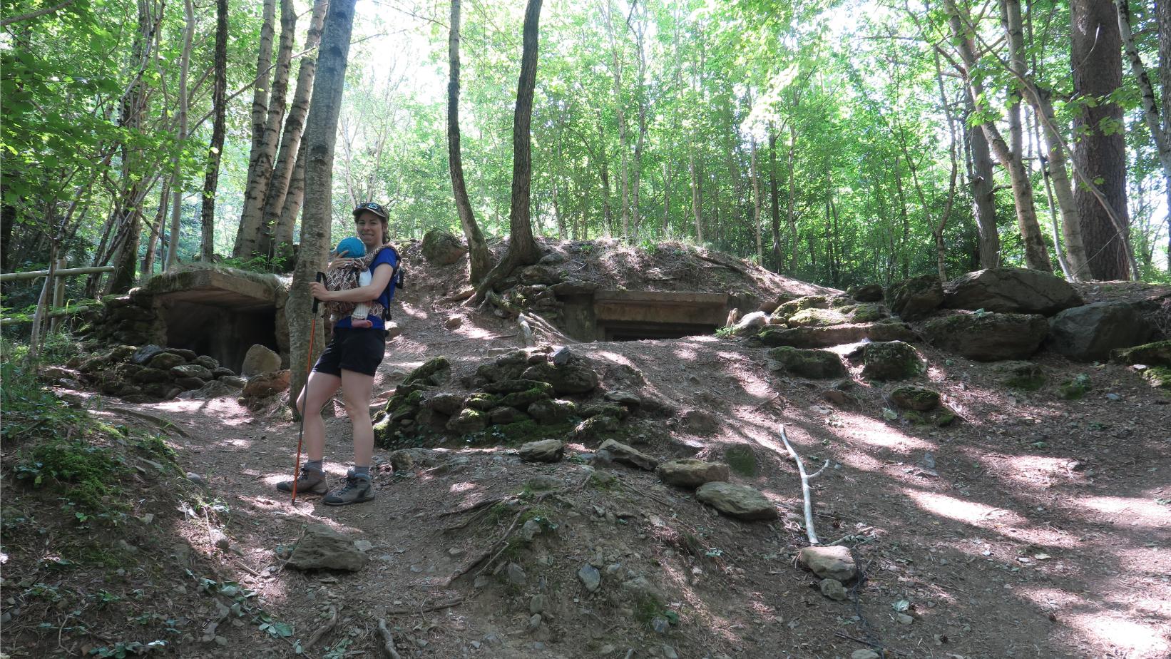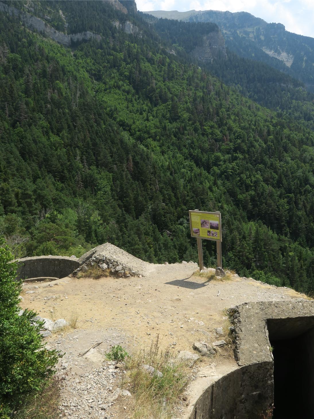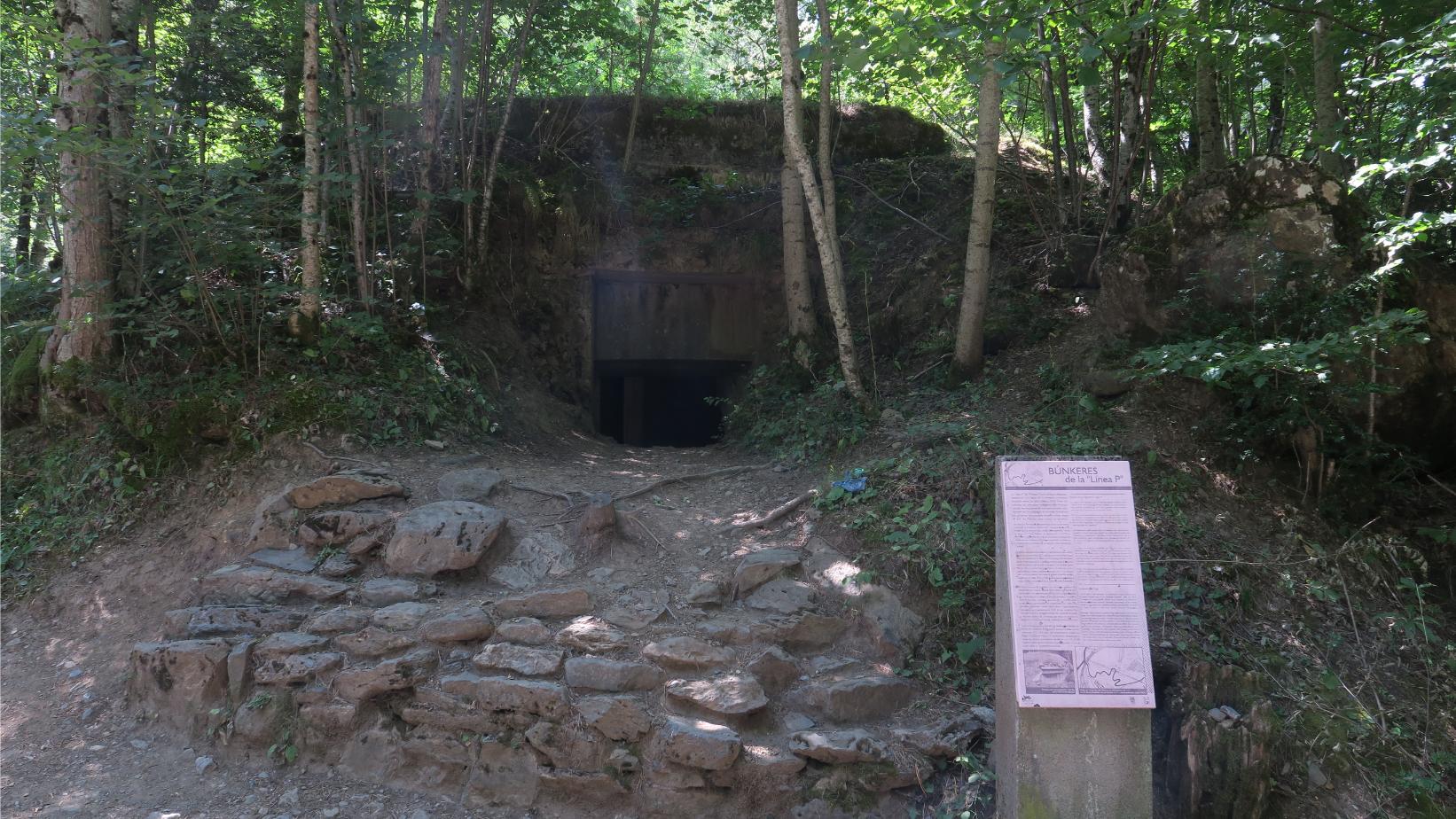 Pronto la senda se interna, en muy suave ascenso, por un frondoso bosque donde la temperatura es bastante más agradable y fresca. Serpenteando unos minutos, el camino llega a los primeros búnkeres de la línea P, justo en el punto en el que nuestra senda se incorpora a la Pista de Picauvé. Merece la pena leer con atención los paneles informativos que explican, con todo lujo de detalles, las obras realizadas en la década de 1940 para fortificar la zona ante una eventual invasión militar desde Francia que nunca llegó a producirse.