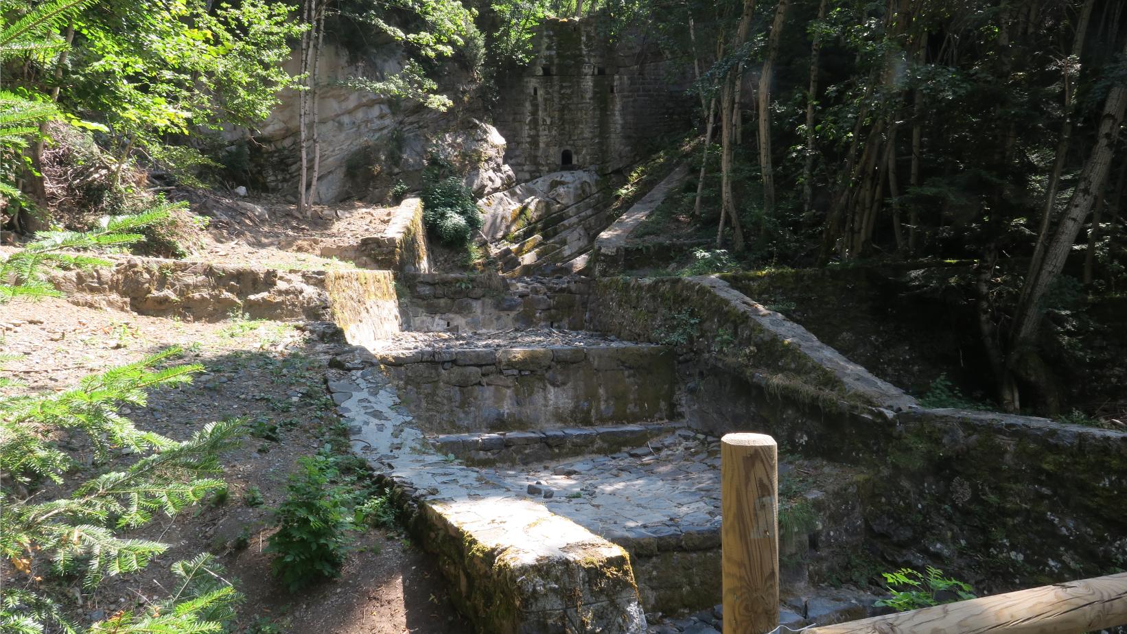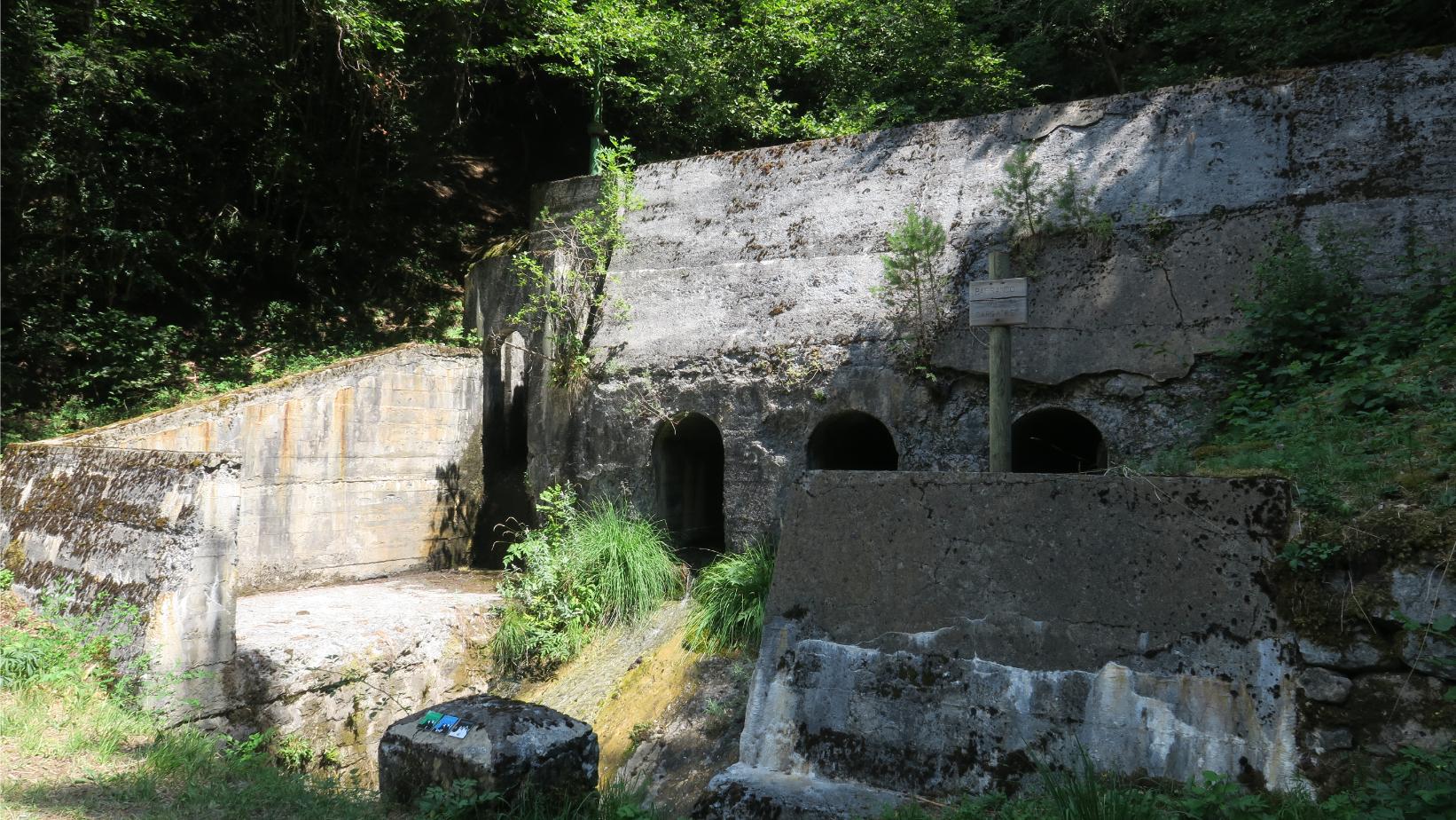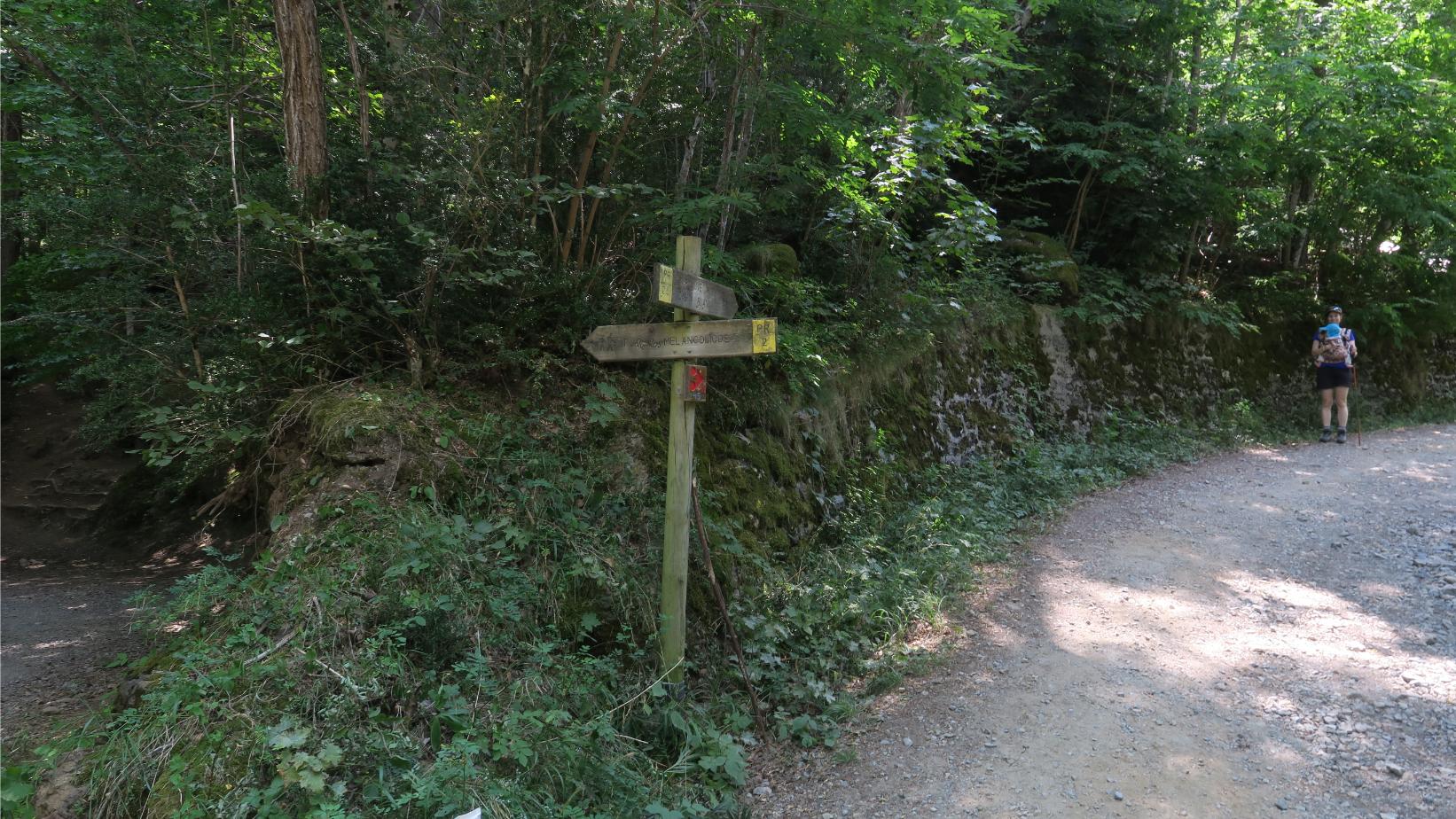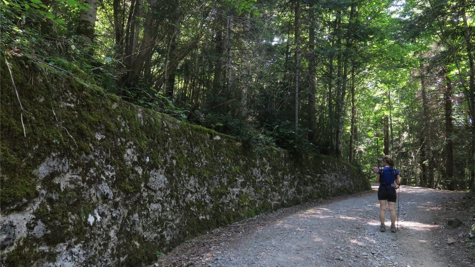 Pronto la senda se interna, en muy suave ascenso, por un frondoso bosque donde la temperatura es bastante más agradable y fresca. Serpenteando unos minutos, el camino llega a los primeros búnkeres de la línea P, justo en el punto en el que nuestra senda se incorpora a la Pista de Picauvé. Merece la pena leer con atención los paneles informativos que explican, con todo lujo de detalles, las obras realizadas en la década de 1940 para fortificar la zona ante una eventual invasión militar desde Francia que nunca llegó a producirse.