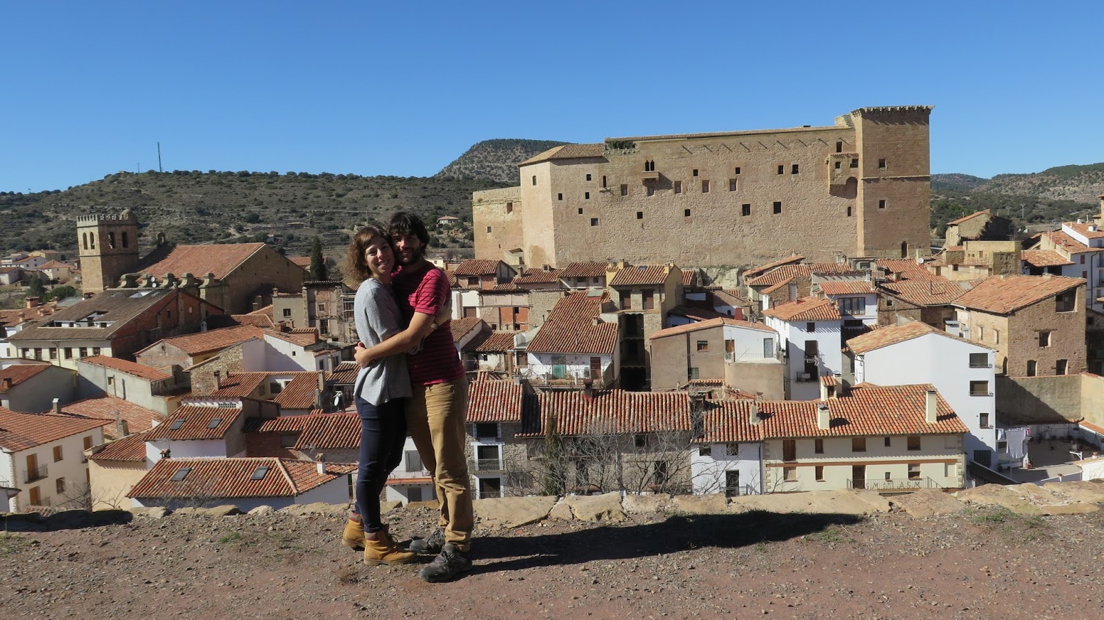 | Disfrutando del soleado día en la entrada del castillo de Mora de Rubielos. |