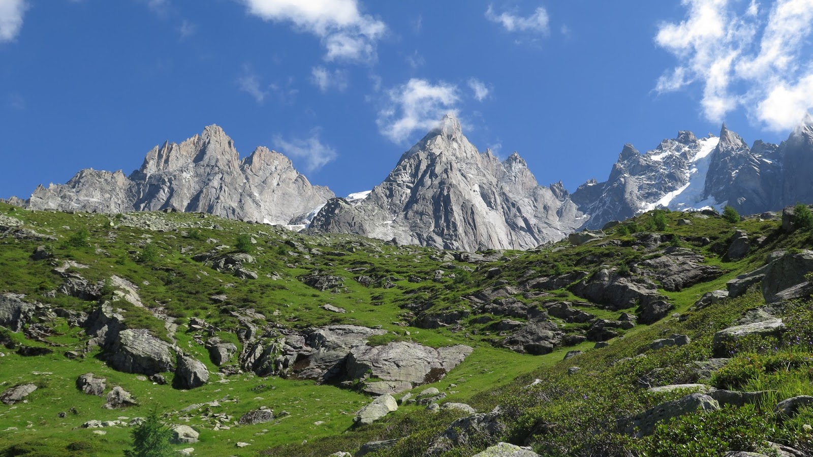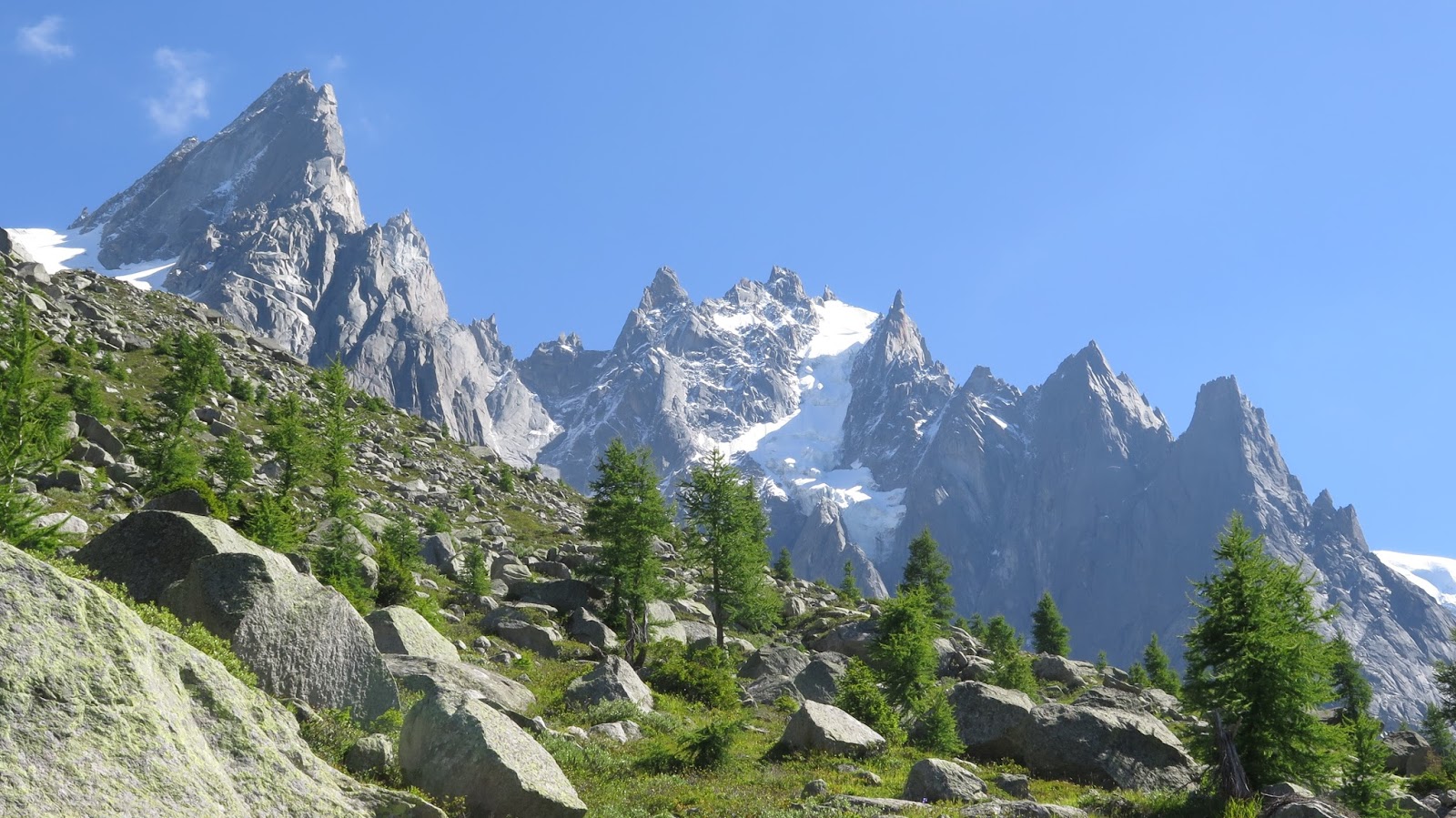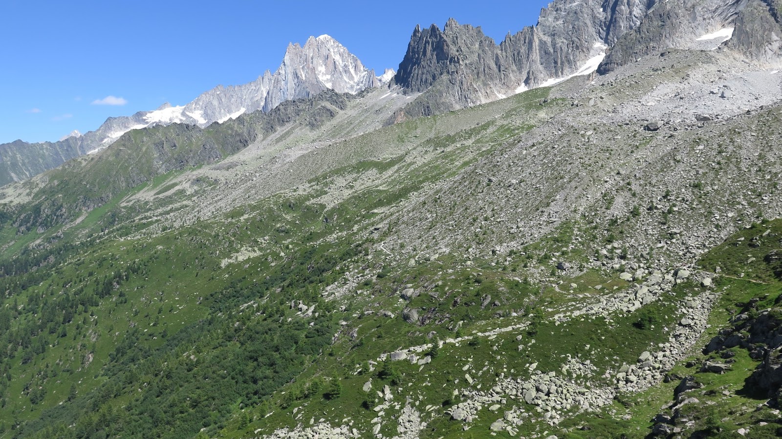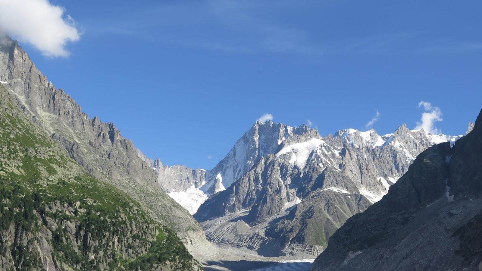 Detrás del glaciar, al fondo, vemos numerosas montañas, entre las que destacan las Grandes Jorasses (4208 metros), Dôme de Rochefort (4015 m), Dent du Géant (4013 m), Aiguille de la République (3305 m) y Aiguille des Grands Charmoz (3445 metros).