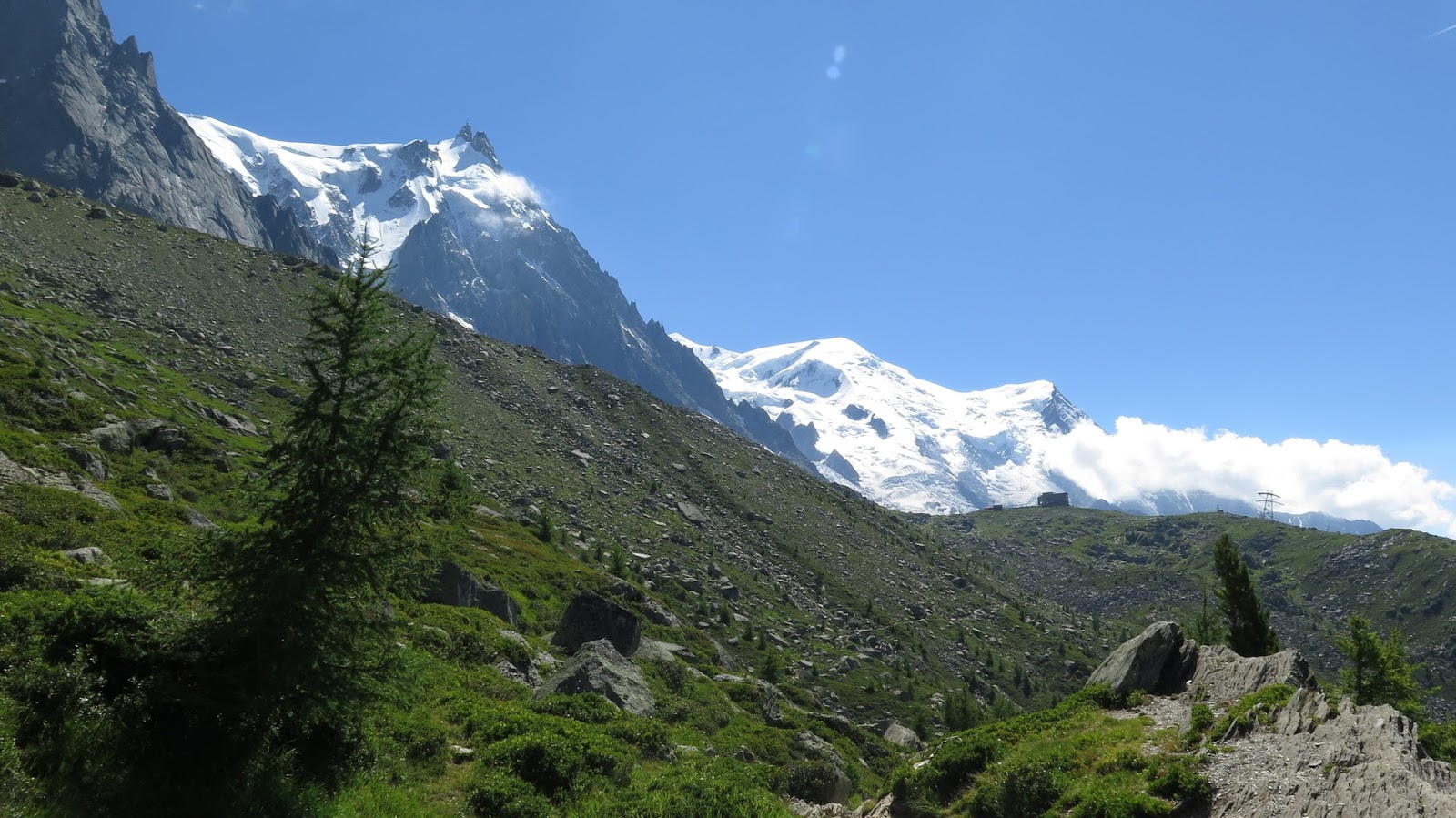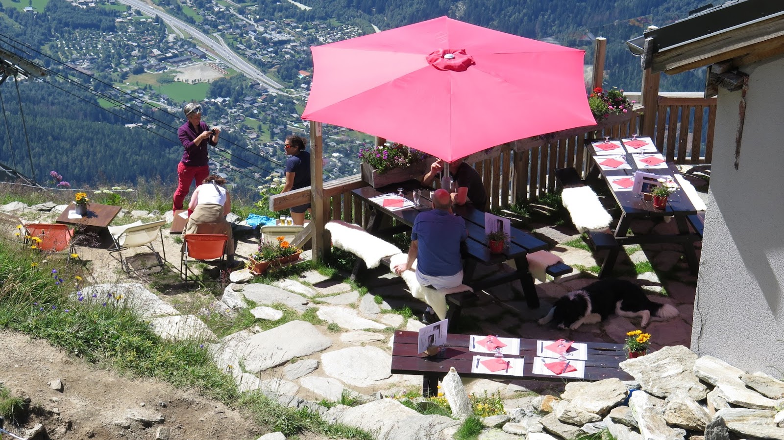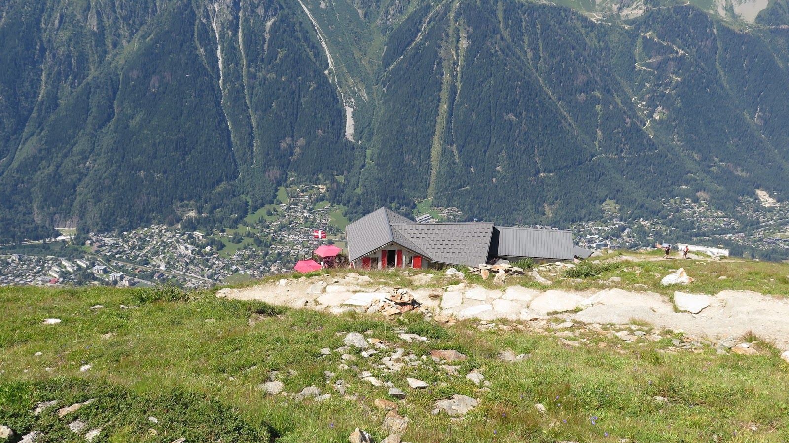 En unos 15 minutos llegamos al refugio de Plan de l’Aiguille, en el que existe una bonita terraza con bar/restaurante y unas vistas espectaculares al valle de Chamonix, Aiguille du Midi y Glacier des Bossons, entre otros.