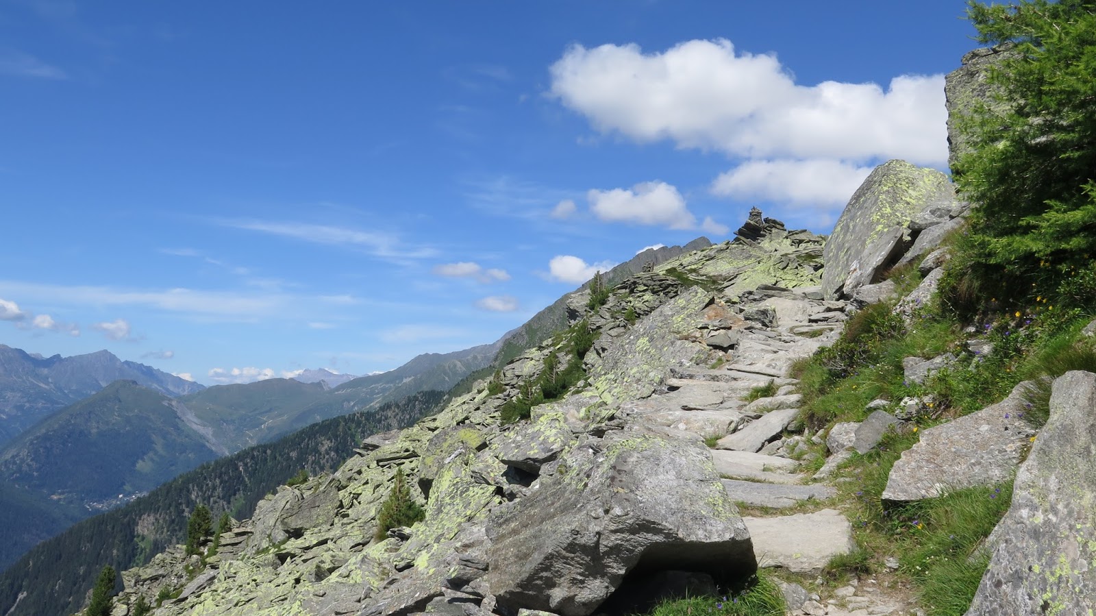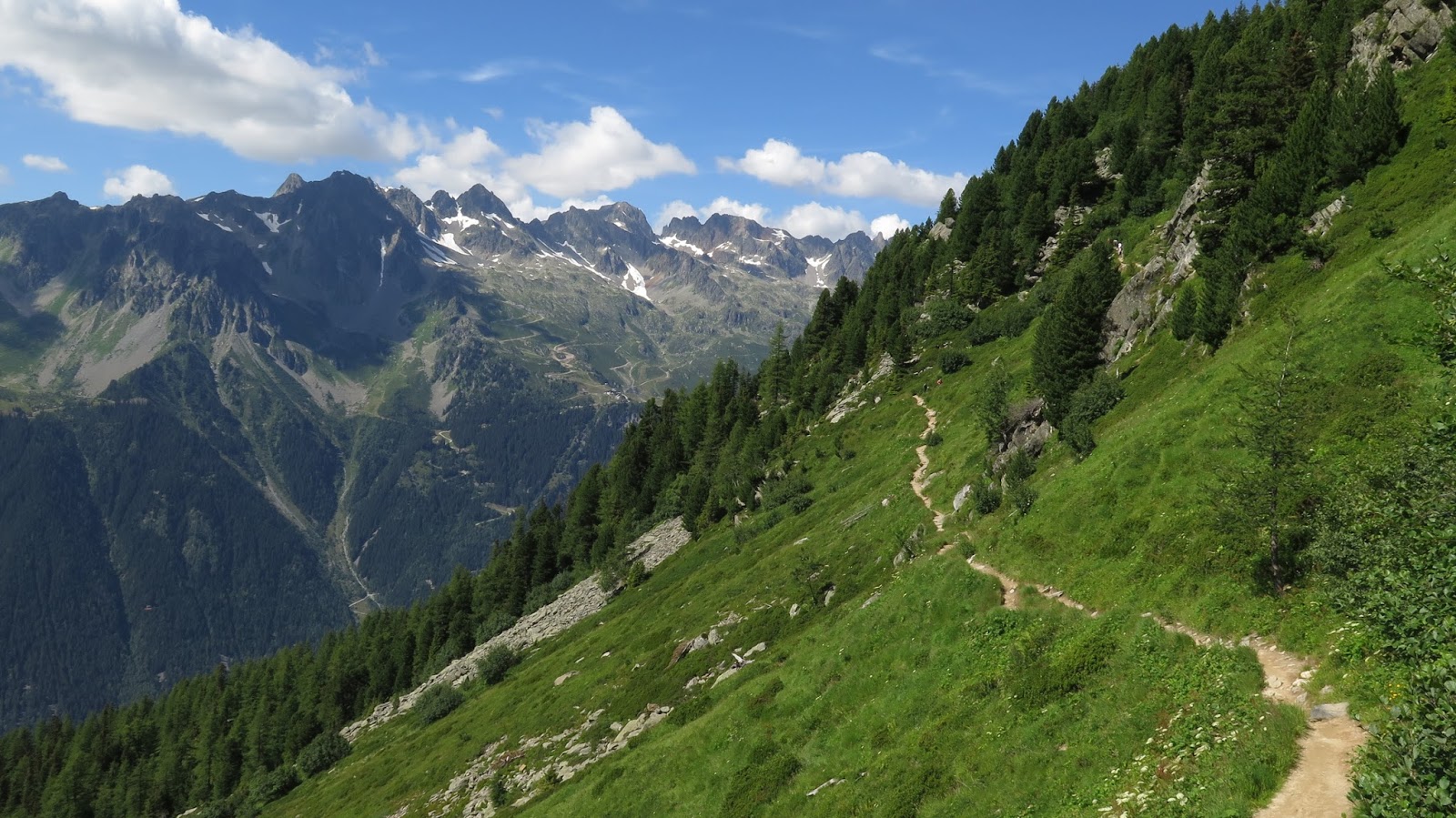 Cuando llevamos 1 hora y 20 minutos de camino, encontramos un desvío a través de cuyos dos ramales podemos llegar a Montenvers. En uno de ellos pone “recomendado”. Nosotros hacemos caso, así que tomamos el desvío de la derecha. (Como después veremos, este es mucho mejor porque asciende a la Signal de Forbes, con unas panorámicas de los valles mucho mejores que el otro desvío).