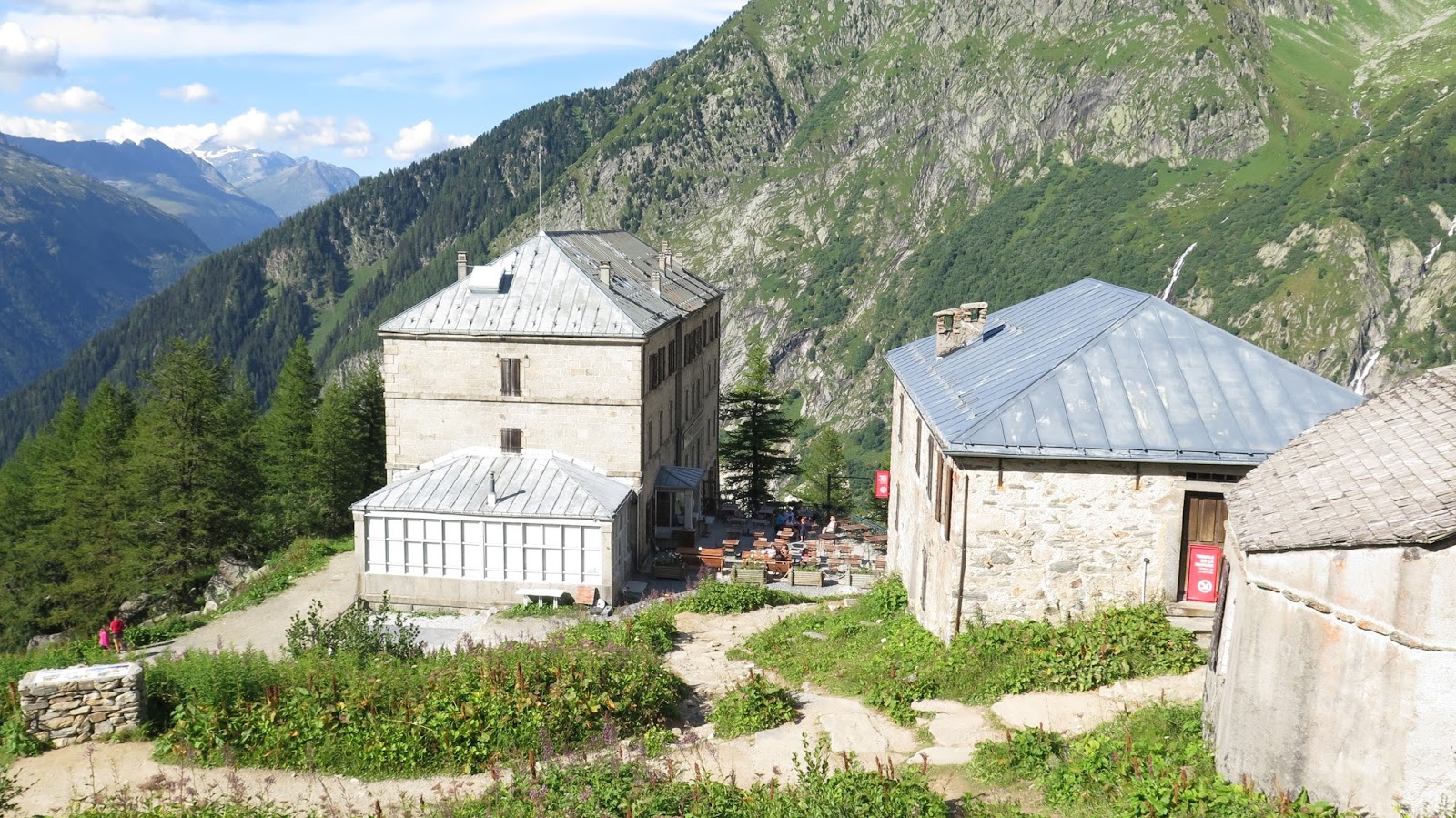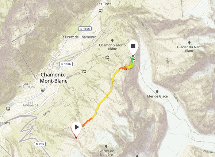 Decidimos reemprender la marcha, que ahora ya continúa en franco descenso hasta la pequeña estación de tren de Montenvers (situada a 1913 metros de altitud), a la cual llegamos tras algo más de 2 horas y 40 minutos de marcha, contando paradas.