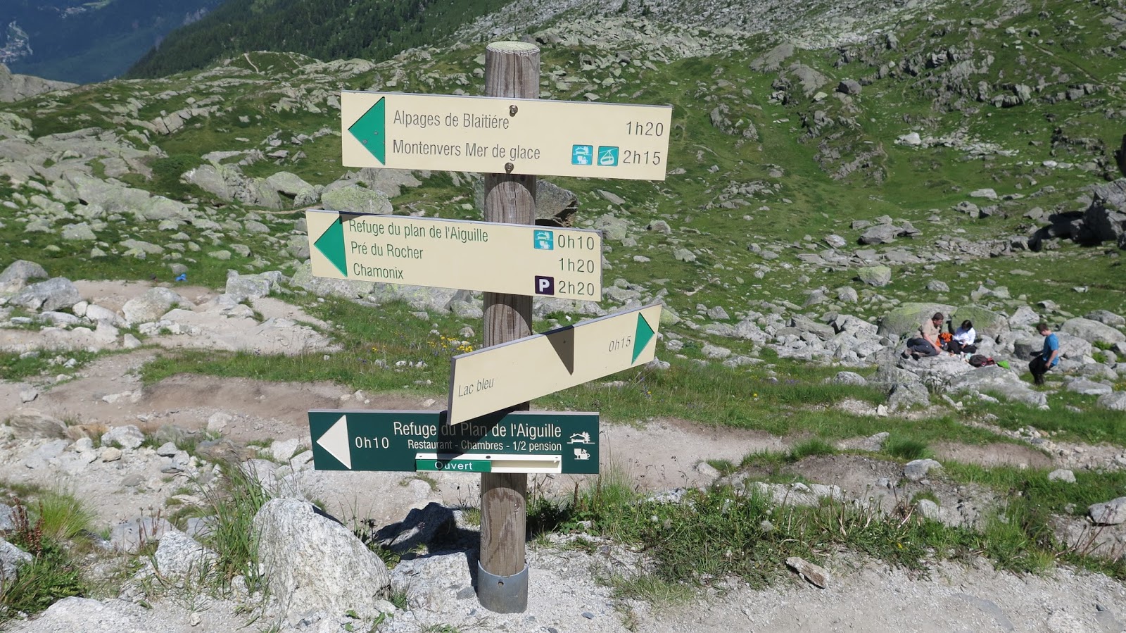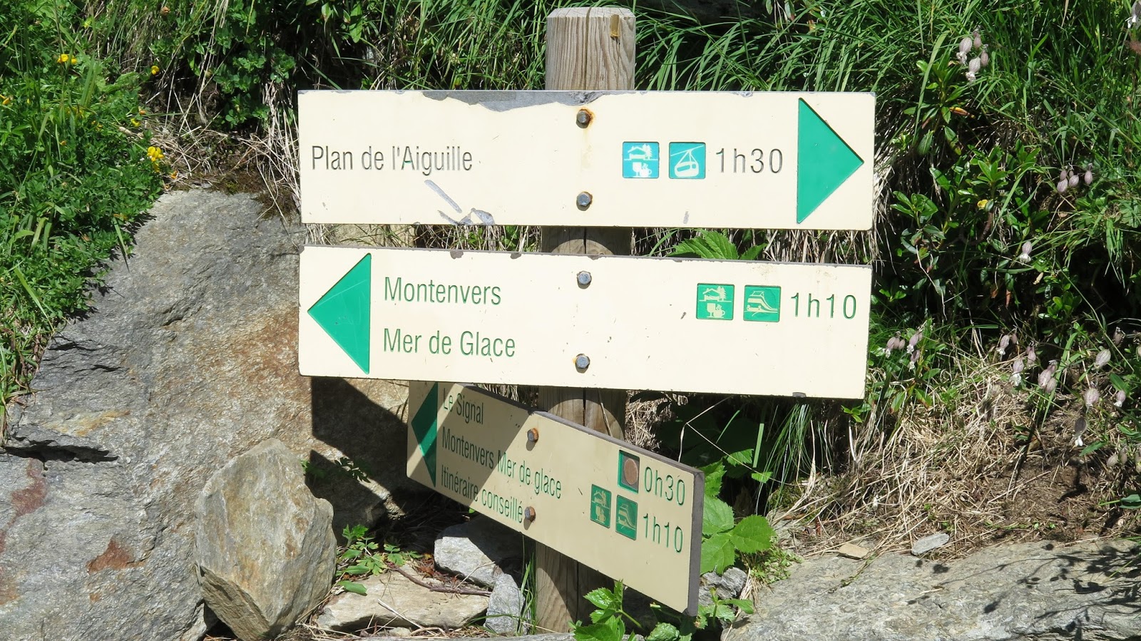 El camino comienza con un suave descenso por una senda bien marcada, con un gran panel indicador. Vemos a numerosas personas, de toda condición física, edad, equipación y simpatía, que llegan a Plan de l’Aiguille como destino final de su ruta.