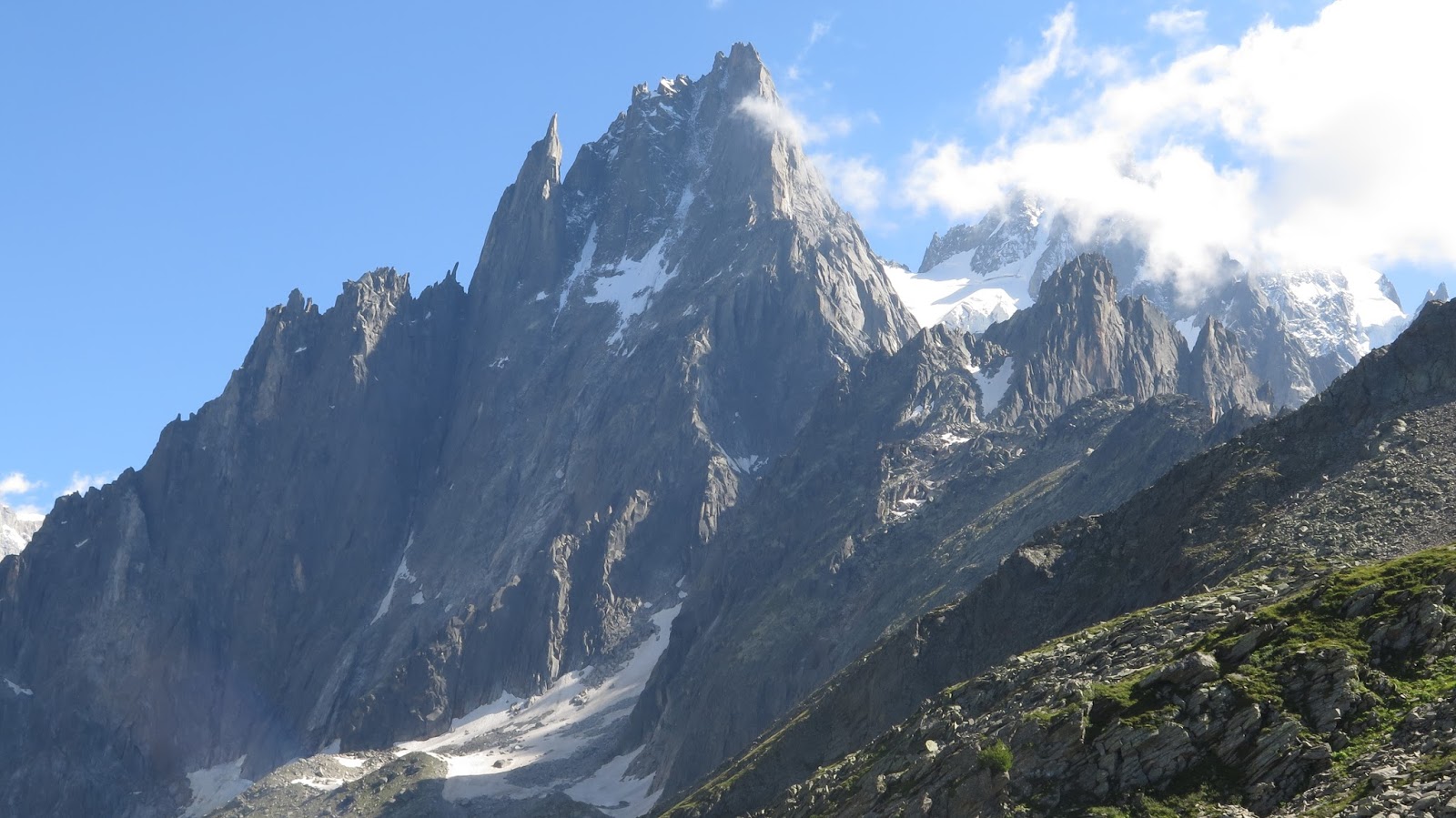 | Aiguille de la République y Aiguille des Grands Charmoz (3445 m). Tapada por las nubes está la Aiguille de Blaitière. |