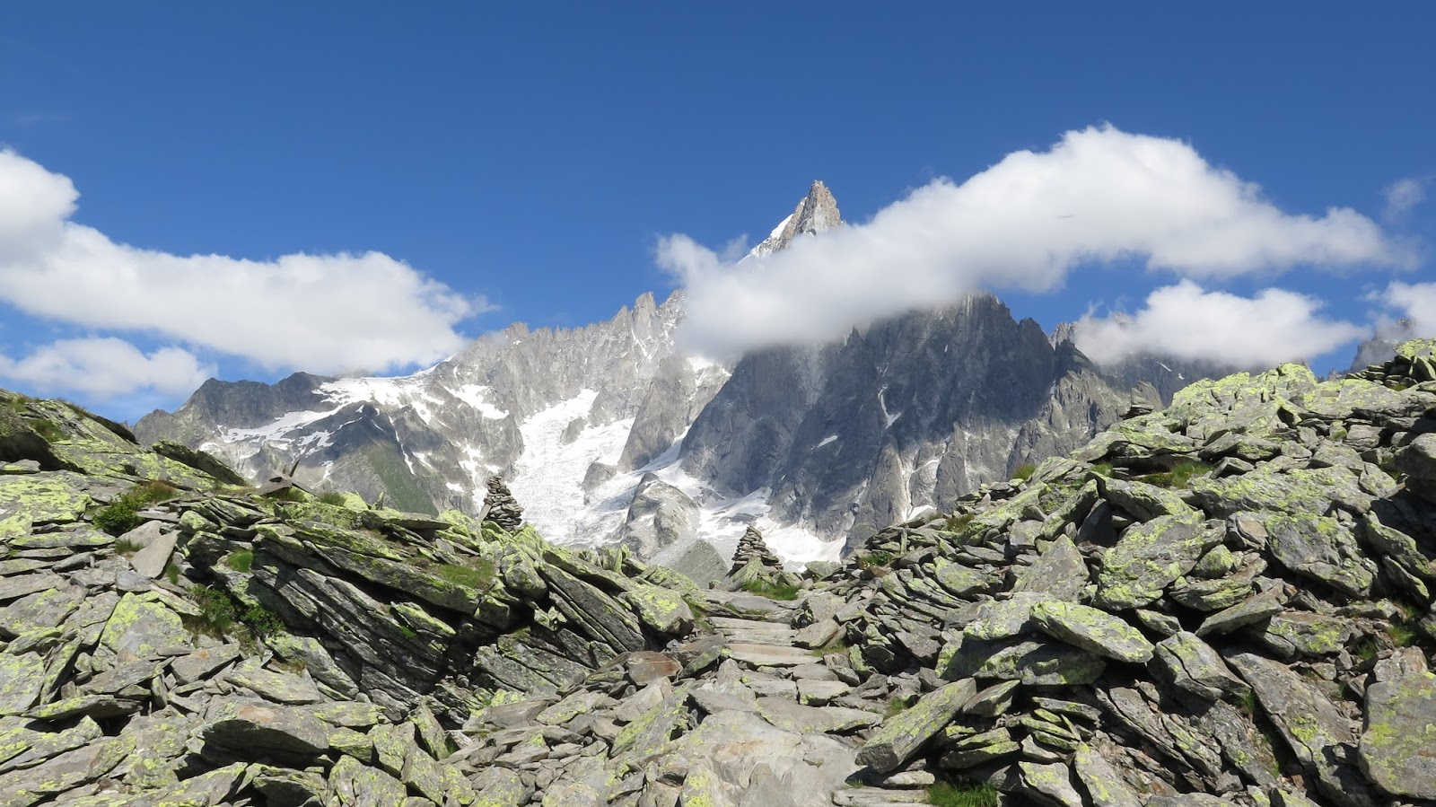 Al terminar este tramo arbolado llegamos a una zona de pequeños bloques de piedra, dirigiéndonos hacia el este, con la magnífica e imponente silueta de Les Drus al fondo, tapada a ratos por las nubes. Se trata, posiblemente, de una de las estampas más relevantes del camino.