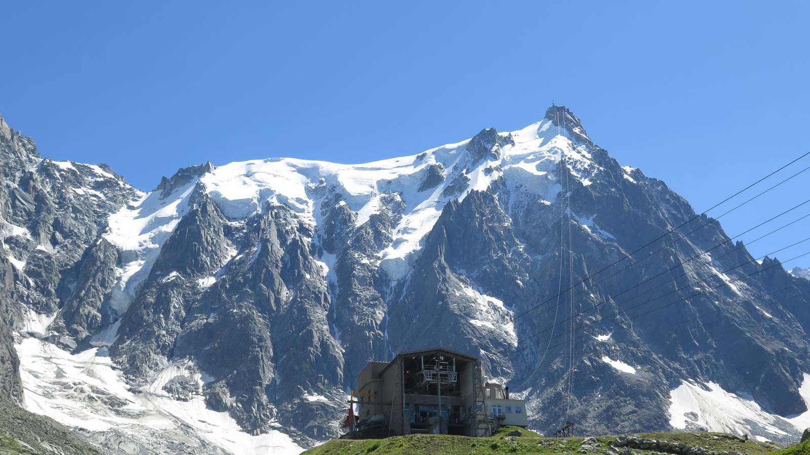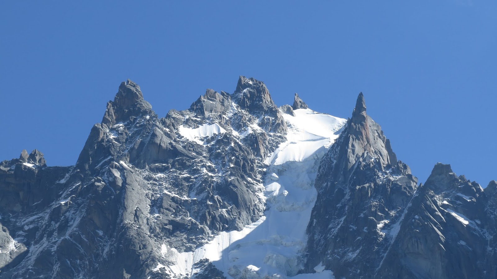 Nos detenemos constantemente a tomar fotografías, puesto que el paisaje es increíble. A nuestras espaldas vemos el teleférico que sube a l’Aiguille du Midi. A su izquierda el Glacier des Pélerins, y más a la izquierda numerosas y verticales agujas (Aiguille du Peine, Aiguille des Pélerins, Aiguille de Blaitiere…).