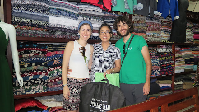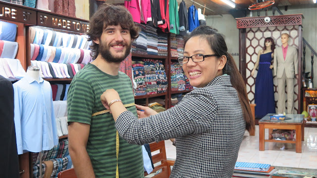 Continuamos paseando por las calles de la ciudad, pasando por delante de numerosas tiendas en las que confeccionan trajes. Tras echar un vistazo a 3 o 4 de ellas (de las que ya sabíamos algo porque nos habíamos informado antes del viaje), decidimos entrar a Hoang Kim. Su trato más cercano nos inspira confianza, así que pronto nos encontramos tomándonos las medidas. Son las 11:00 aproximadamente y nos indican que sobre las 19:00 pasemos de nuevo por allí para probarnos el traje… ¡ya hecho!