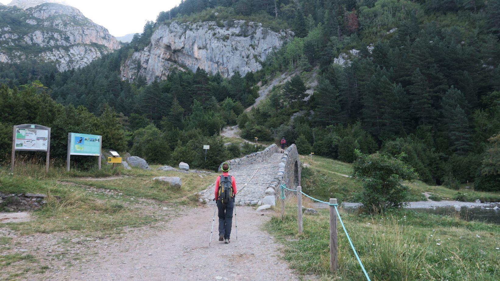 Abrigados, puesto que la mañana comienza fresca antes de que el sol rebase las montañas, comenzamos la ruta cruzando el célebre puente de San Nicolás de Bujaruelo.