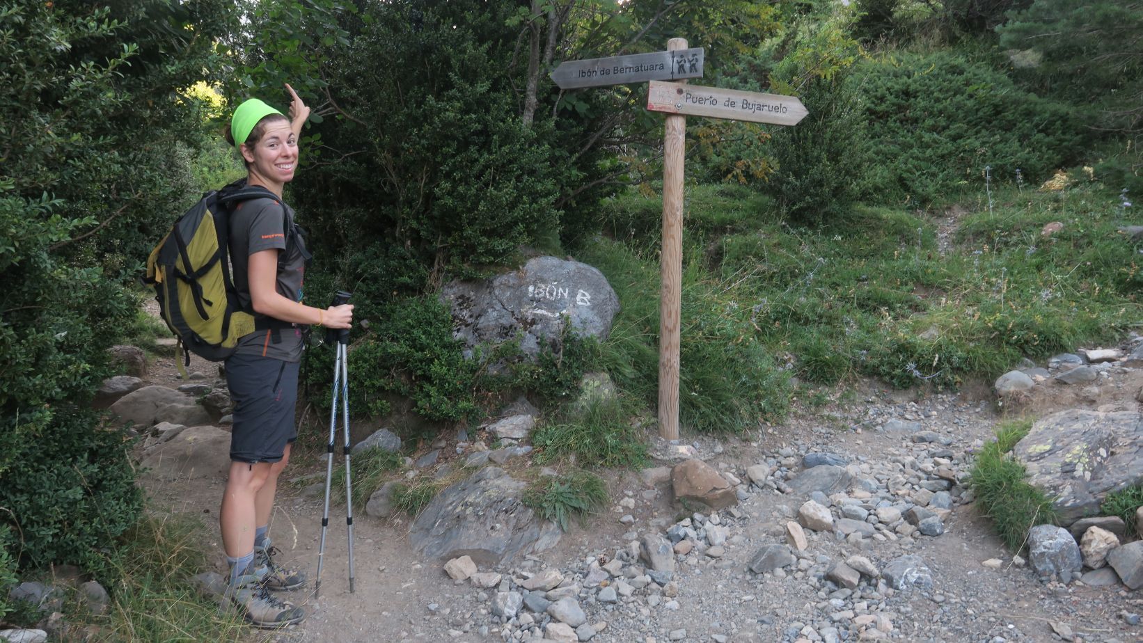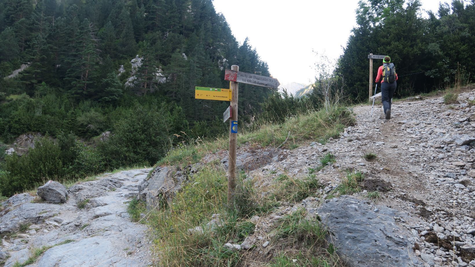 Nada más atravesarlo vemos el primer poste indicador, que nos señala el camino ascendente hacia el Puerto de Bujaruelo y, tan solo unos metros más allá, otro poste que indica el Ibón de Bernatuara. Seguimos, pues, dichas indicaciones.