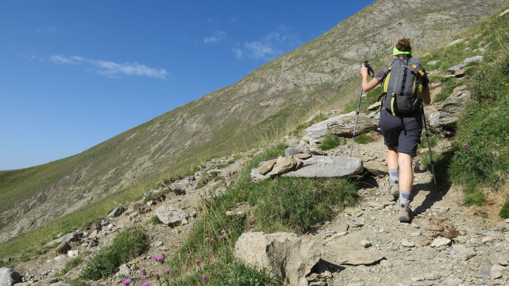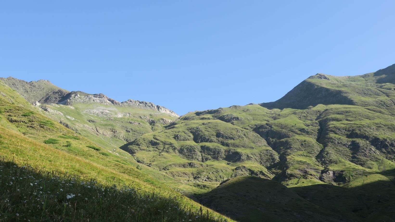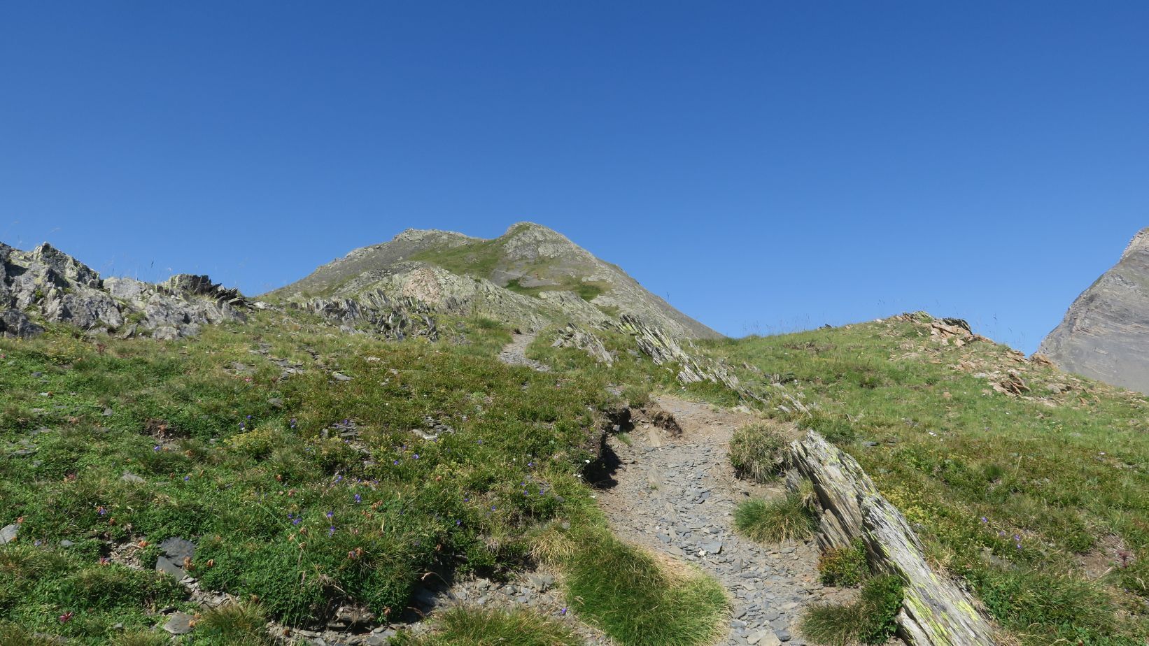 Superadas las duras rampas, y ya en torno a la cota 2300, el camino suaviza, e incluso desciende ligeramente en busca de un evidente collado herboso, tras el cual ya se intuye la cubeta del ibón.