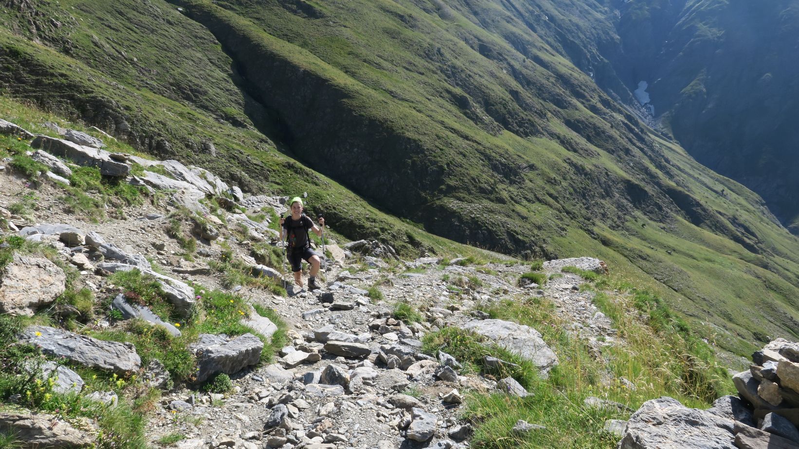 Apenas nos quedan unos minutos hasta alcanzar dicho collado, donde el viento que asciende por el valle sopla con fuerza moderada y nos refresca.