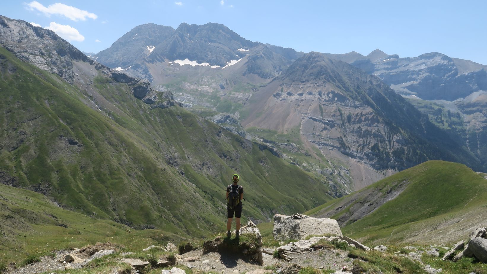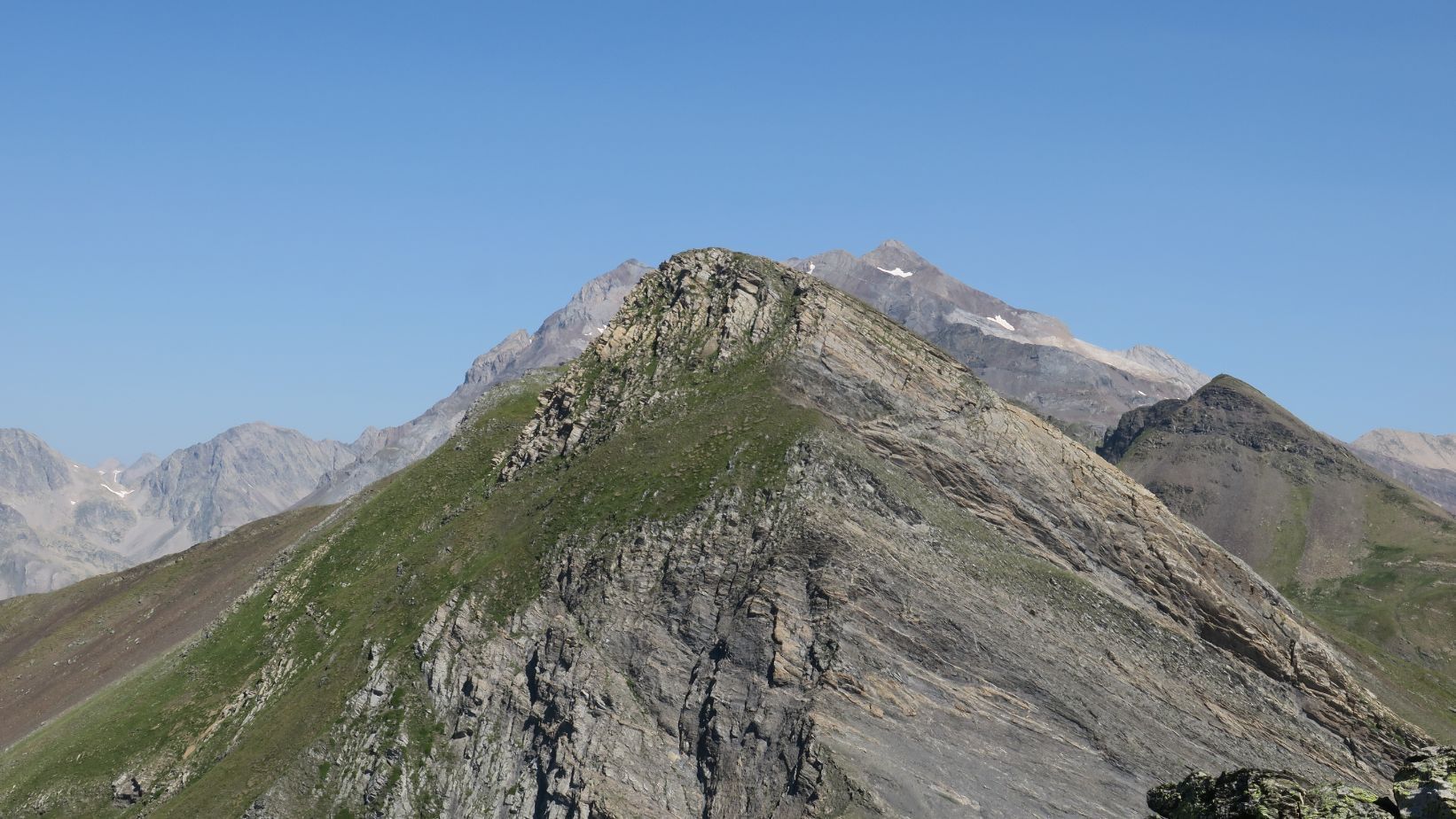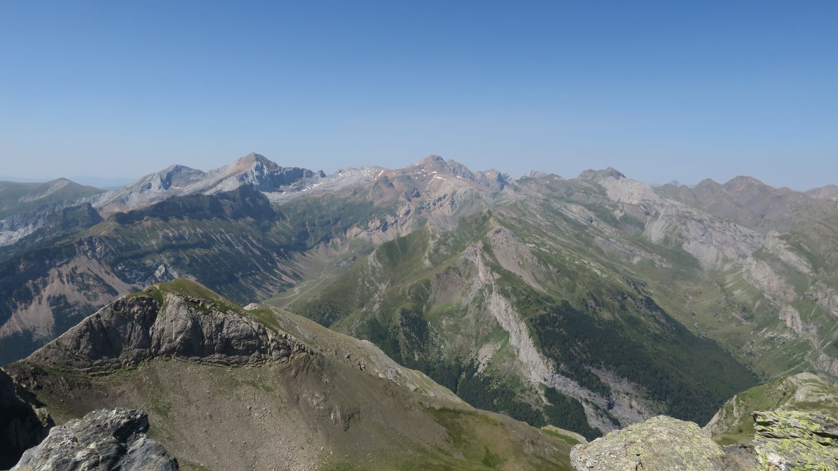 Magnífico mirador en todas las direcciones. Gabietos y Taillon; a lo lejos otras cumbres de Ordesa e incluso la cima del Monte Perdido. Hacia el suroeste el Pico Otal y Tendeñera, cerrando por el sur el Valle de Otal. Hacia el norte una miríada de montañas francesas; la única que reconocemos, alzándose majestuosa, es el Vignemale, conocido como Comachibosa en la vertiente aragonesa.