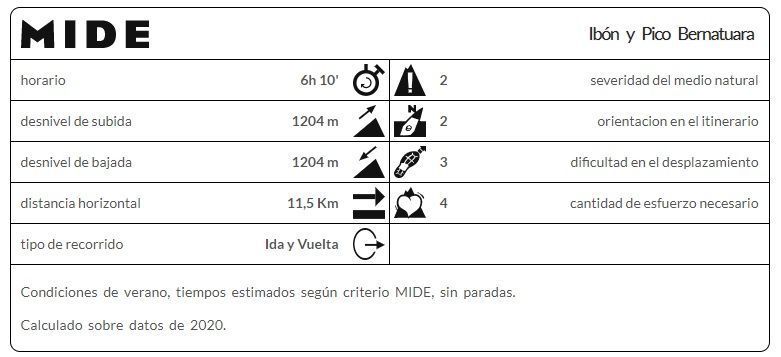 Duración sin paradas: 5 horas y 10 minutos (ruta completa hasta el Pico de Bernatuara, ida y vuelta), a buen ritmo.