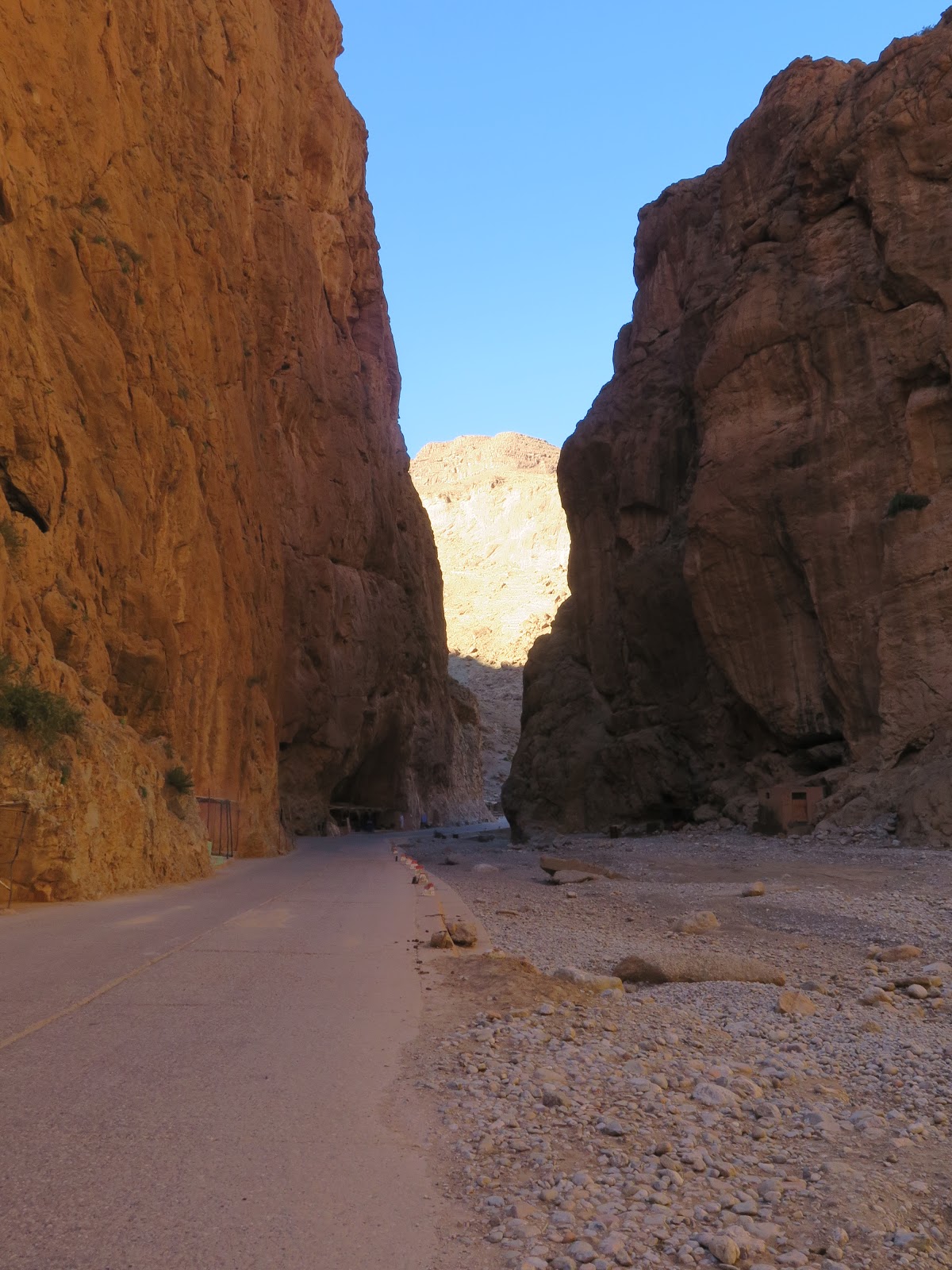 Pocos kilómetros más al norte se encuentran las Gargantas del Todra. Descendemos del coche y nos tomamos un tiempo en pasear por la carretera que serpentea por el fondo del impresionante cañón. Hace viento y mucho frío a estas horas de la mañana, pero el lugar merece la pena.