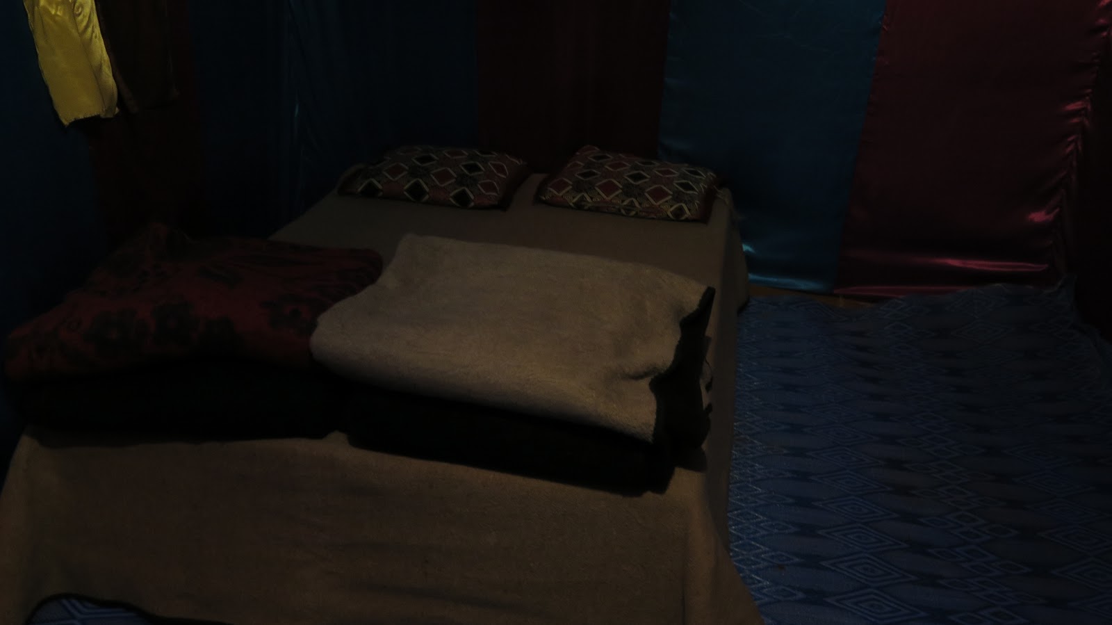 Llevamos nuestras mochilas a las haimas donde dormiremos. Son amplias y tenemos una cama con varias mantas, puesto que la temperatura ha caído en picado.