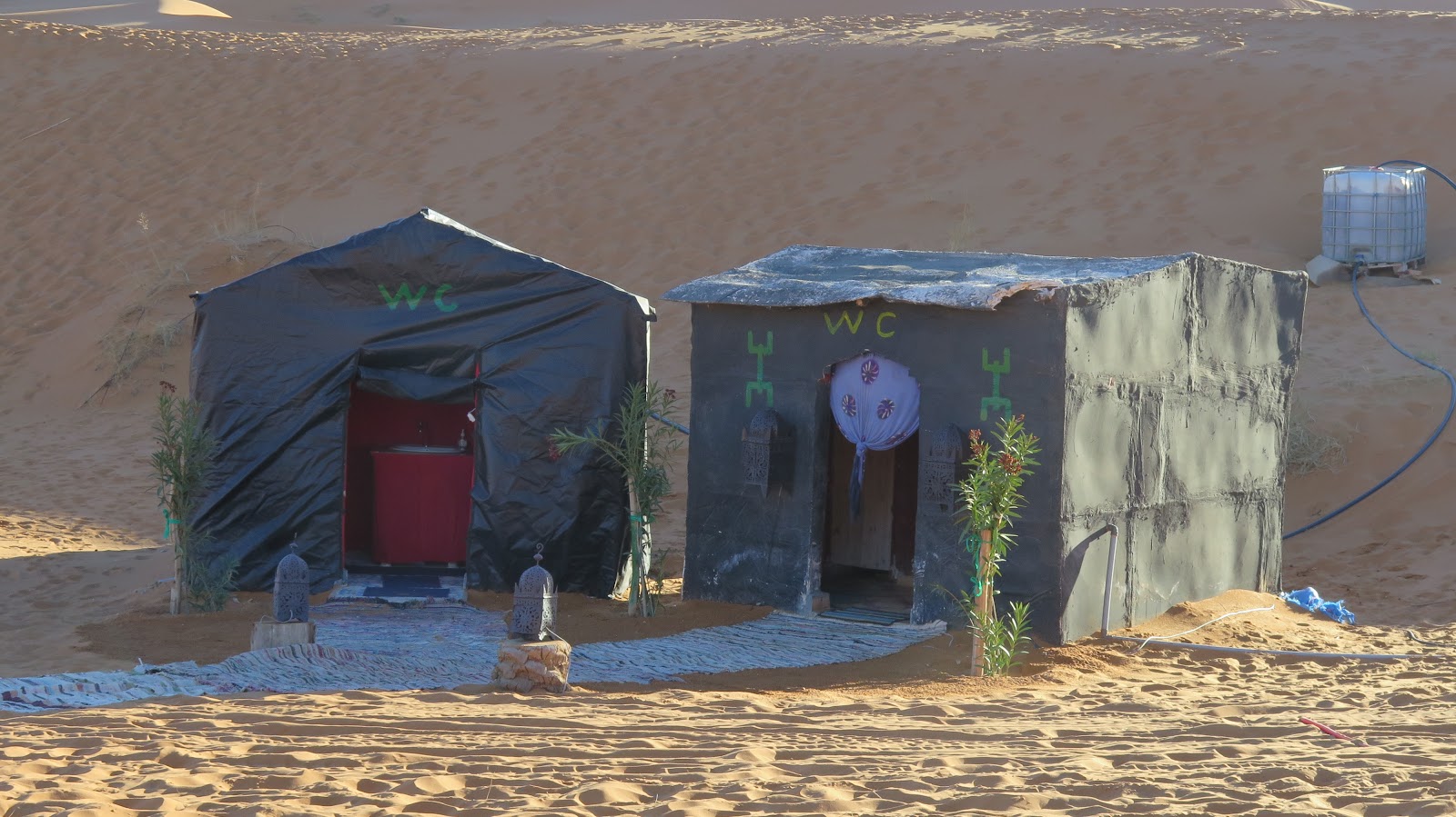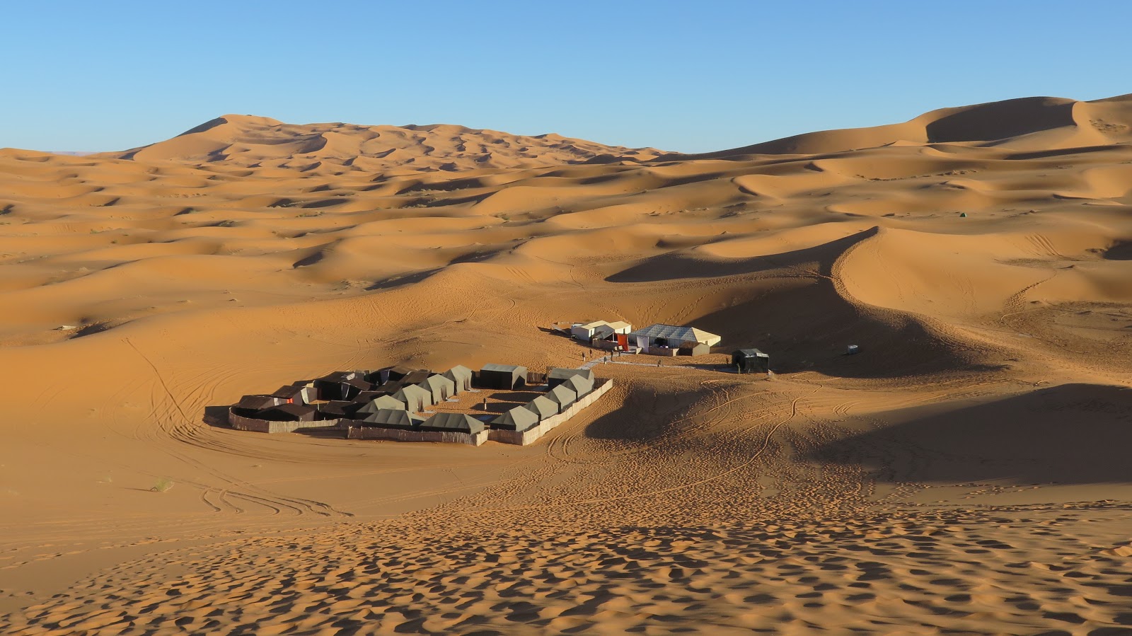 Al otro lado vemos ya nuestro campamento, por lo que descendemos para dejar las mochilas y decir que ya hemos llegado. El campamento está muy bien arreglado; además de las haimas donde dormiremos existe una sala para comedor, una cocina y unos baños, todo bastante decente y preparado para acoger cálidamente a los viajeros. Cogemos la cámara, las chaquetas y subimos de nuevo a la duna.