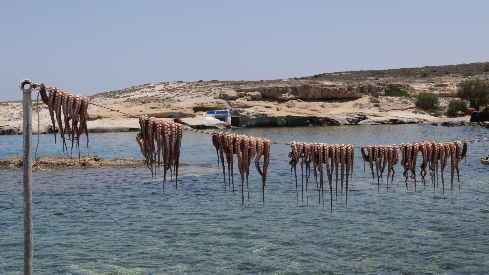 Mandrakia es una diminuta pero coqueta localidad situada en una pequeña ensenada, con casitas de colores donde atracan los barcos de los pescadores locales. Nos acercamos a su fotogénica parte baja, en que algunos pulpos se secan, de manera tradicional, al sol.