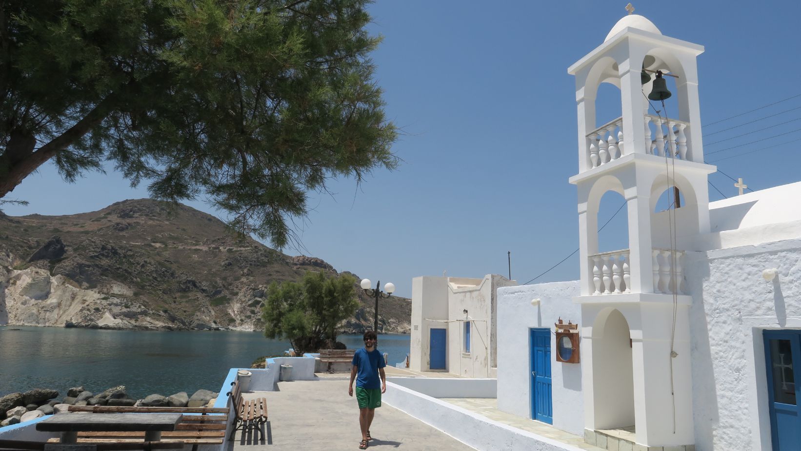 Sin embargo, sí que optamos por ir a la cercana Iglesia de Agios Nikolaos, muy fotogénica con su típica pintura blanca y azul. Uno de los rincones más coquetos de Milos, aunque no muy conocido.