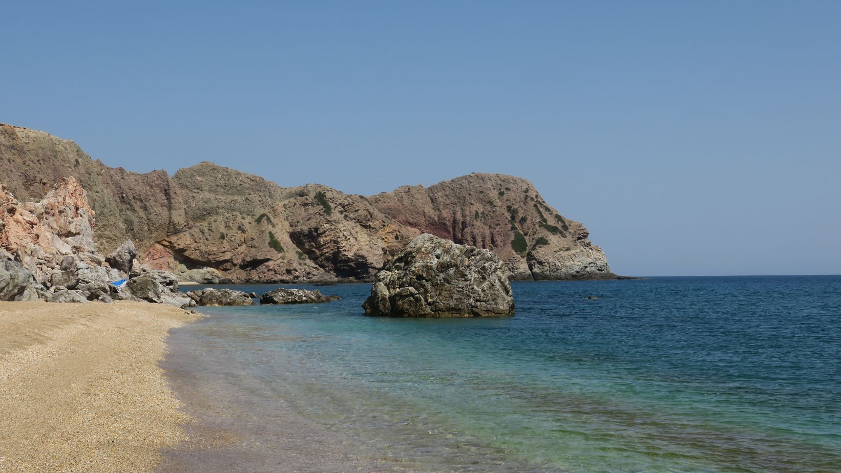 Por ello, decidimos continuar recorriendo la isla para descubrir nuevas playas. La primera de ellas es la de Voudhia, en el extremo este de la isla. Aunque la entrada a la playa resulta ciertamente fea (junto a una gran planta de extracción de minerales, de la que salen gigantescos cargueros), caminando por ella se llega a zonas más tranquilas y de aguas claras. Superado un pequeño espolón rocoso, caminando unos metros por el agua, hallamos una zona más tranquila con arcos en la roca de gran belleza. Estamos un par de horas por allí, disfrutando del entorno casi en soledad.