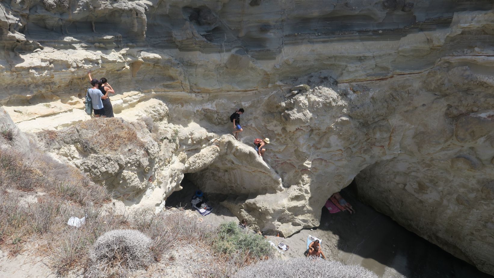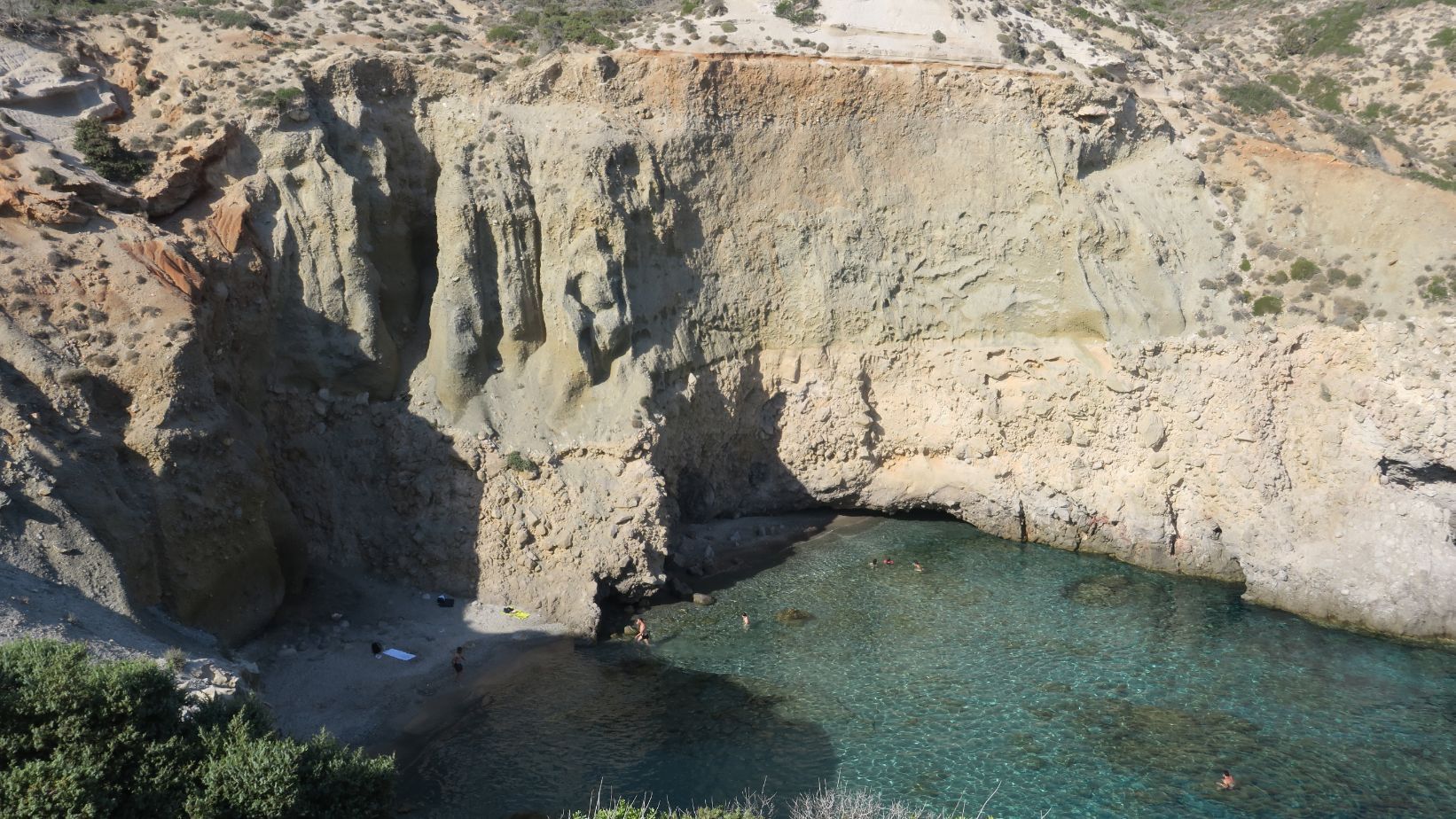 Recorremos la costa sur de Milos, de aguas límpidas y tranquilas, aproximadamente una hora hasta llegar a la zona de Kleftikos. Se trata de un bello rincón con varias cuevas y arcos naturales, de aguas limpias, donde nadar o hacer snorkel (aunque no hay demasiados peces). El agua, transparente y tranquila, invita al baño, por lo que nos relajamos una hora por allí.