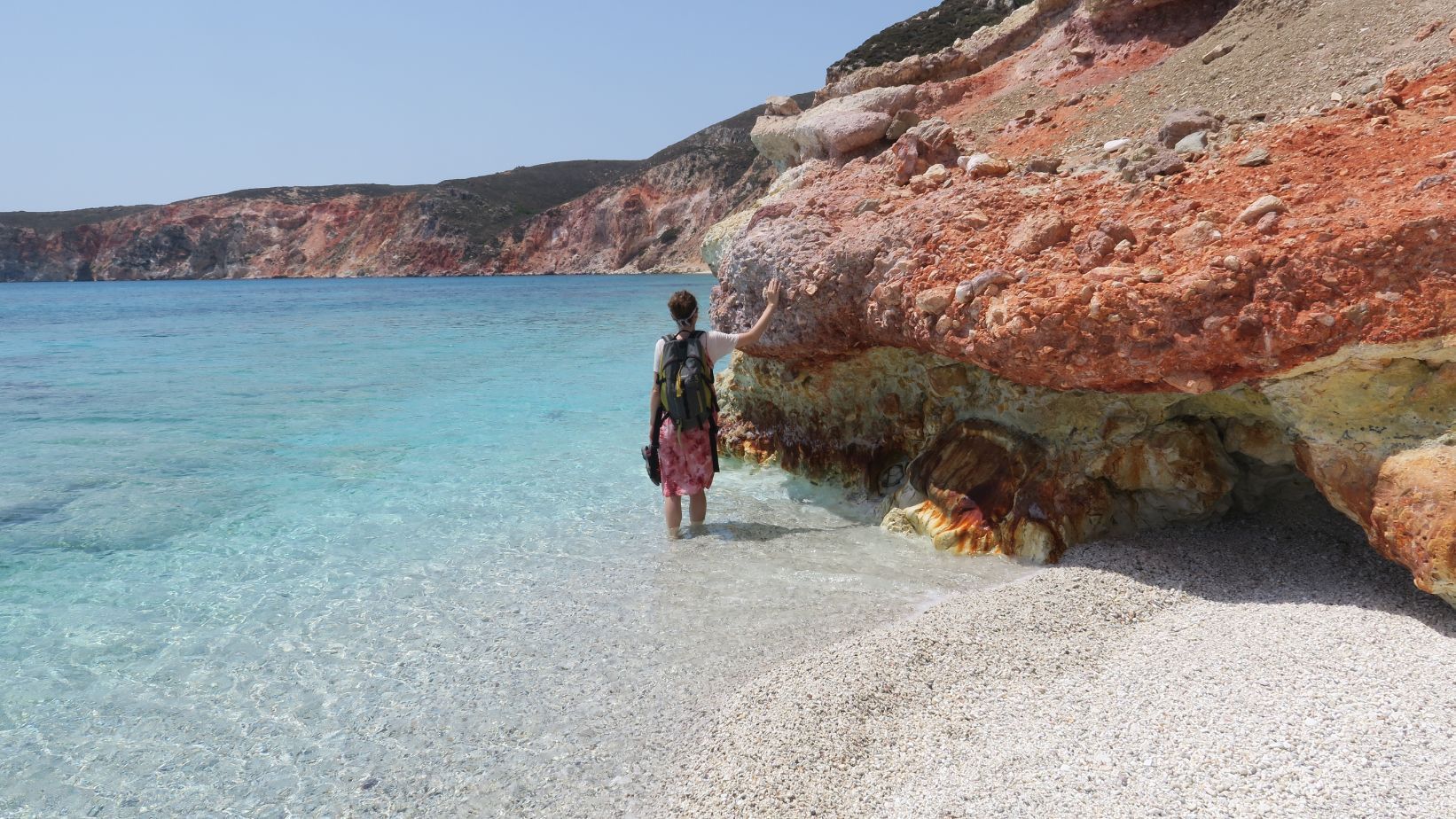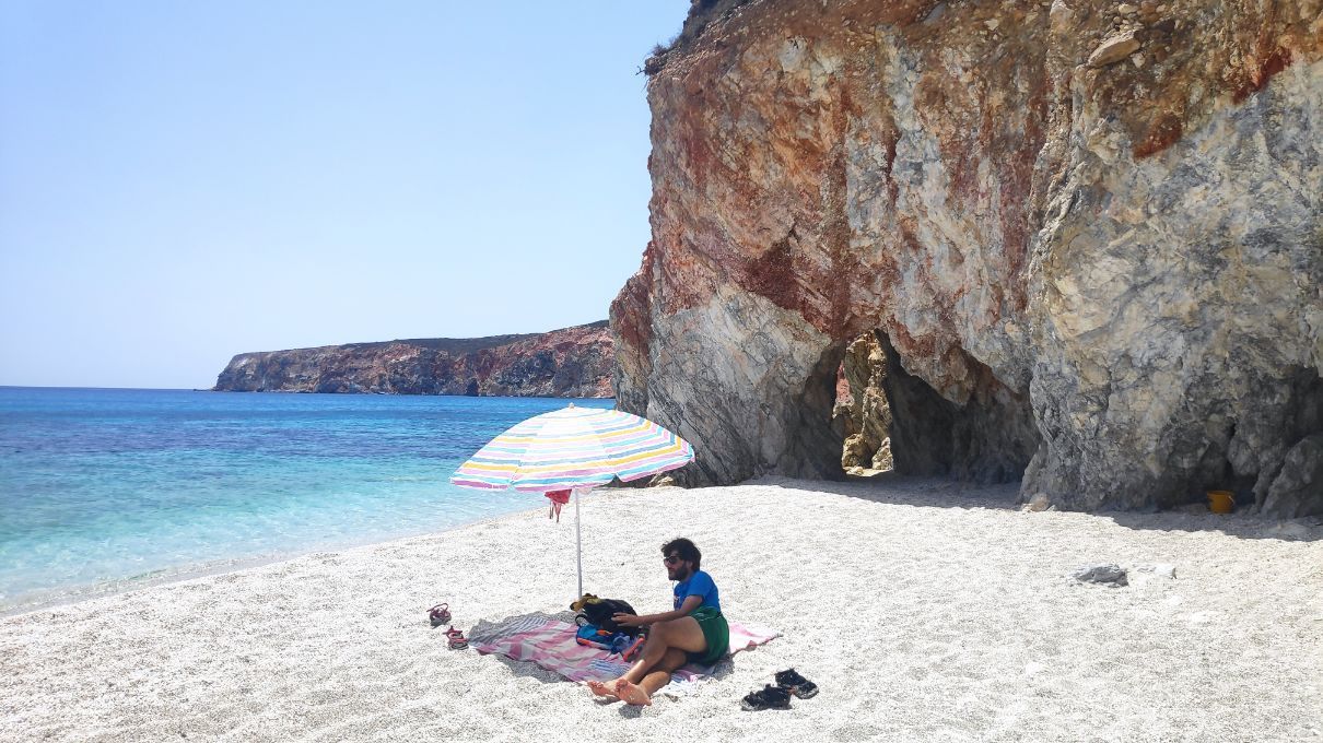 Tenemos que seguir con nuestro día de descubrimiento de Milos, por lo que montamos de nuevo en el coche para dirigirnos a la playa de Paleochori. Grande y tranquila, aunque con un chiringuito bastante ajetreado en su entrada, merece la pena recorrerla con calma, por lo que paseamos un buen rato por allí.