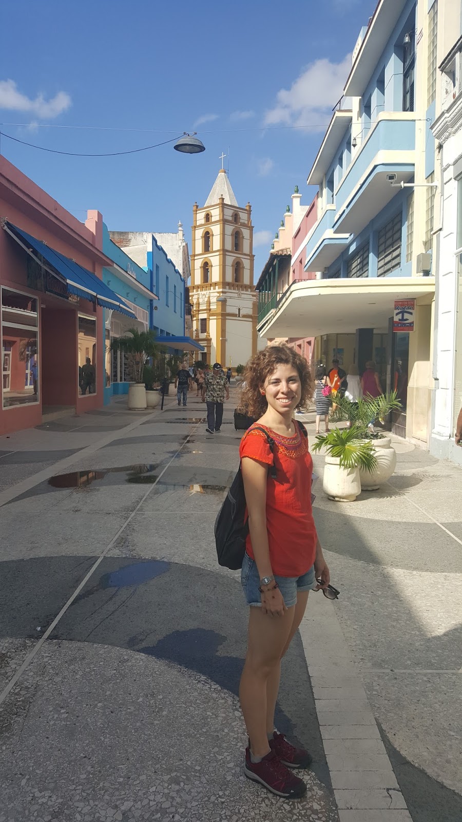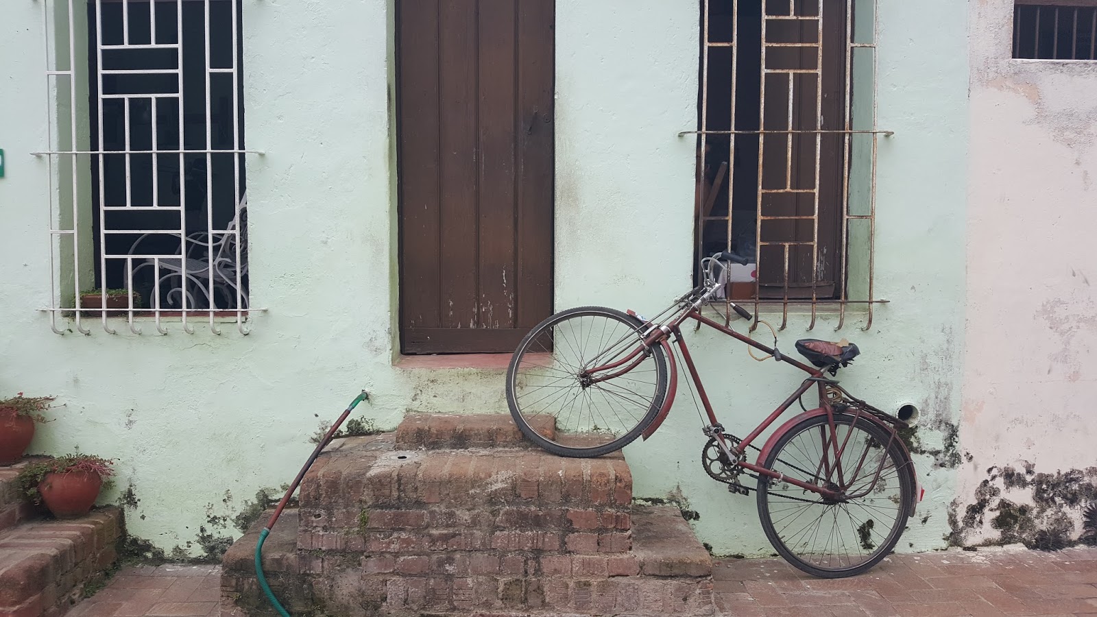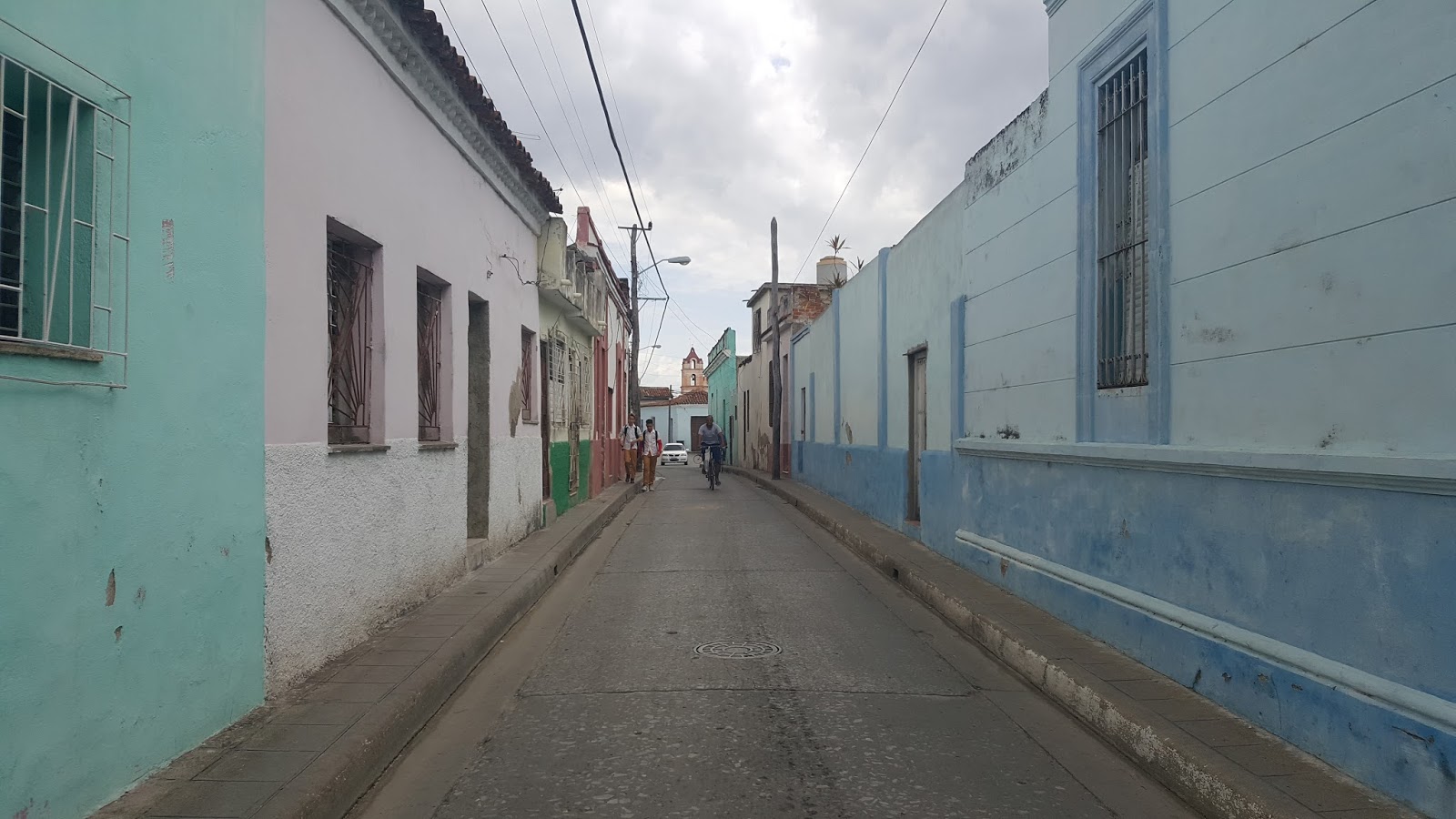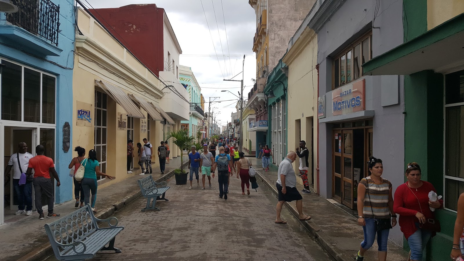 El cielo se pone amenazante, con nubes oscuras que cada vez se acercan más a la ciudad. Pronto comienzan a caer unas pocas gotas que, en cuestión de segundos, se convierten en un fuerte chaparrón. Esperamos, agazapados en el portal de una casa, a que pase la lluvia; una vez se calma regresamos al centro por una de las calles principales de Camagüey: la calle República, repleta de comercios y algún que otro bar.