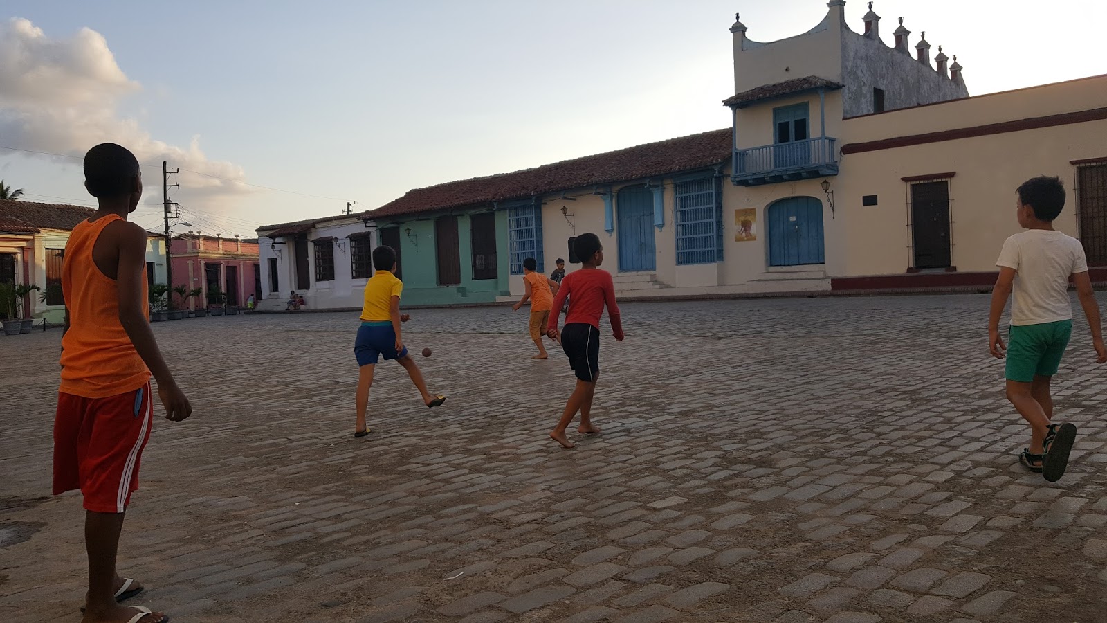 Regresamos al centro, paseando por callejuelas estrechas en las que ver la vida cotidiana de la ciudad, hasta llegar de nuevo a la Plaza de San Juan de Dios. Allí nos sentamos durante un buen rato a mirar cómo juegan al fútbol unos niños cubanos.