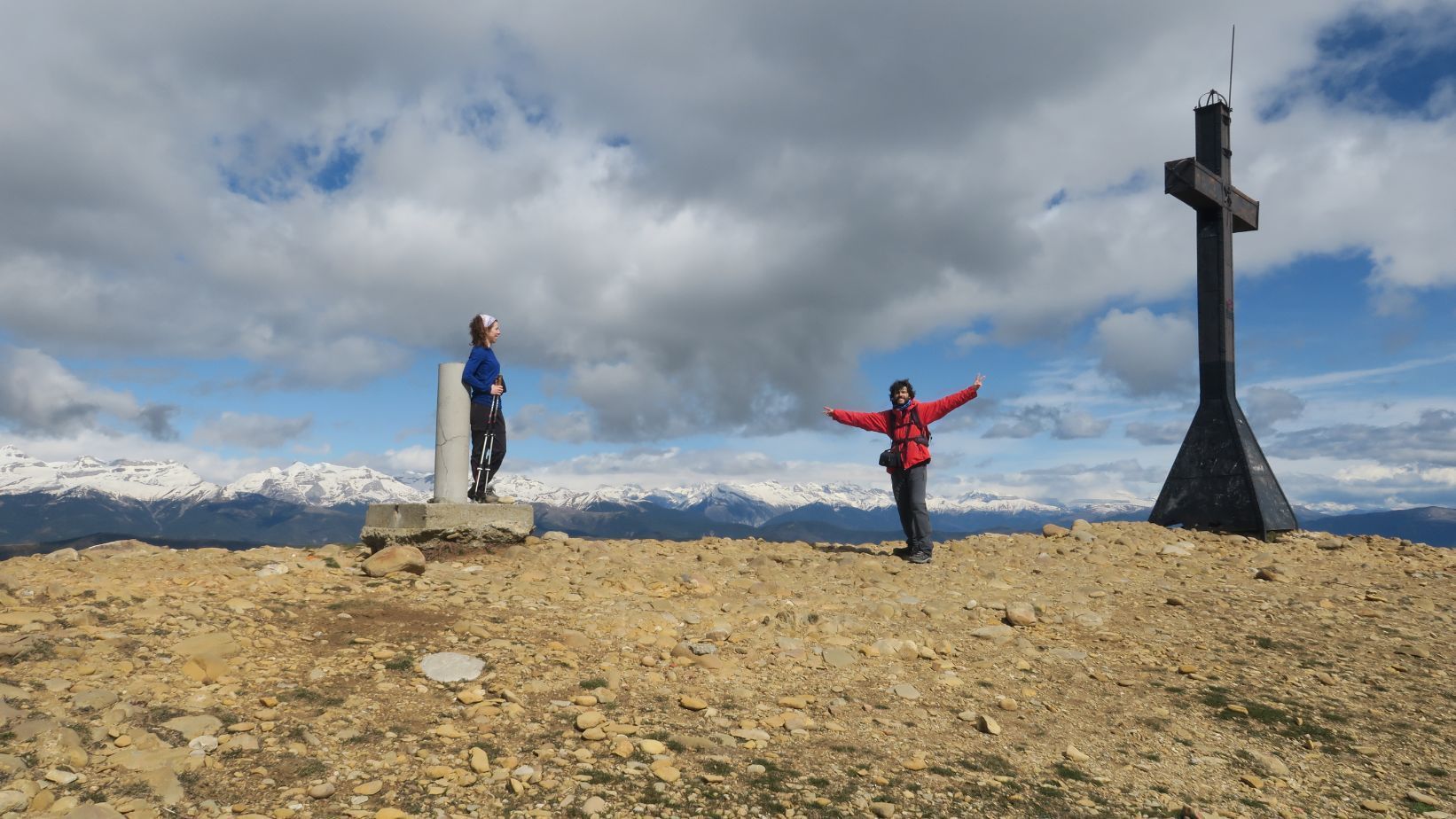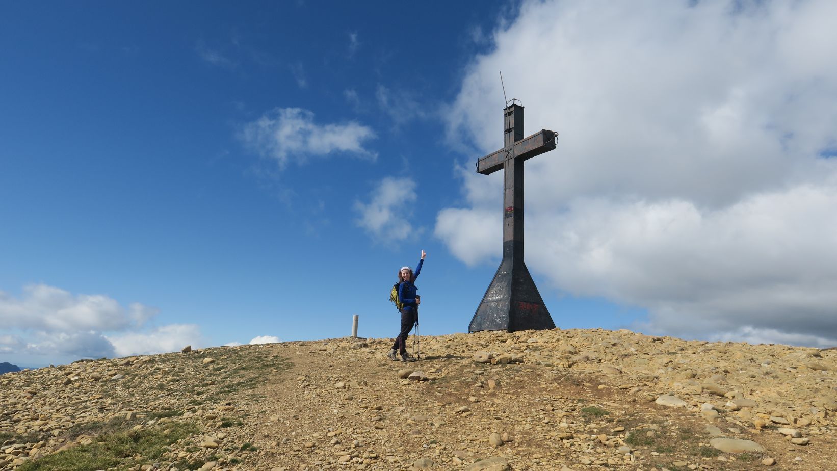 Remontamos los últimos metros, algo más duros, hasta alcanzar la cumbre de la Peña Oroel (3,6 km; 1 hora y 25 minutos; 1769 metros de altitud). Junto al vértice geodésico destaca la mítica cruz de color negro de 9 metros de altitud, que fue instalada en este lugar a comienzos del siglo XX.
