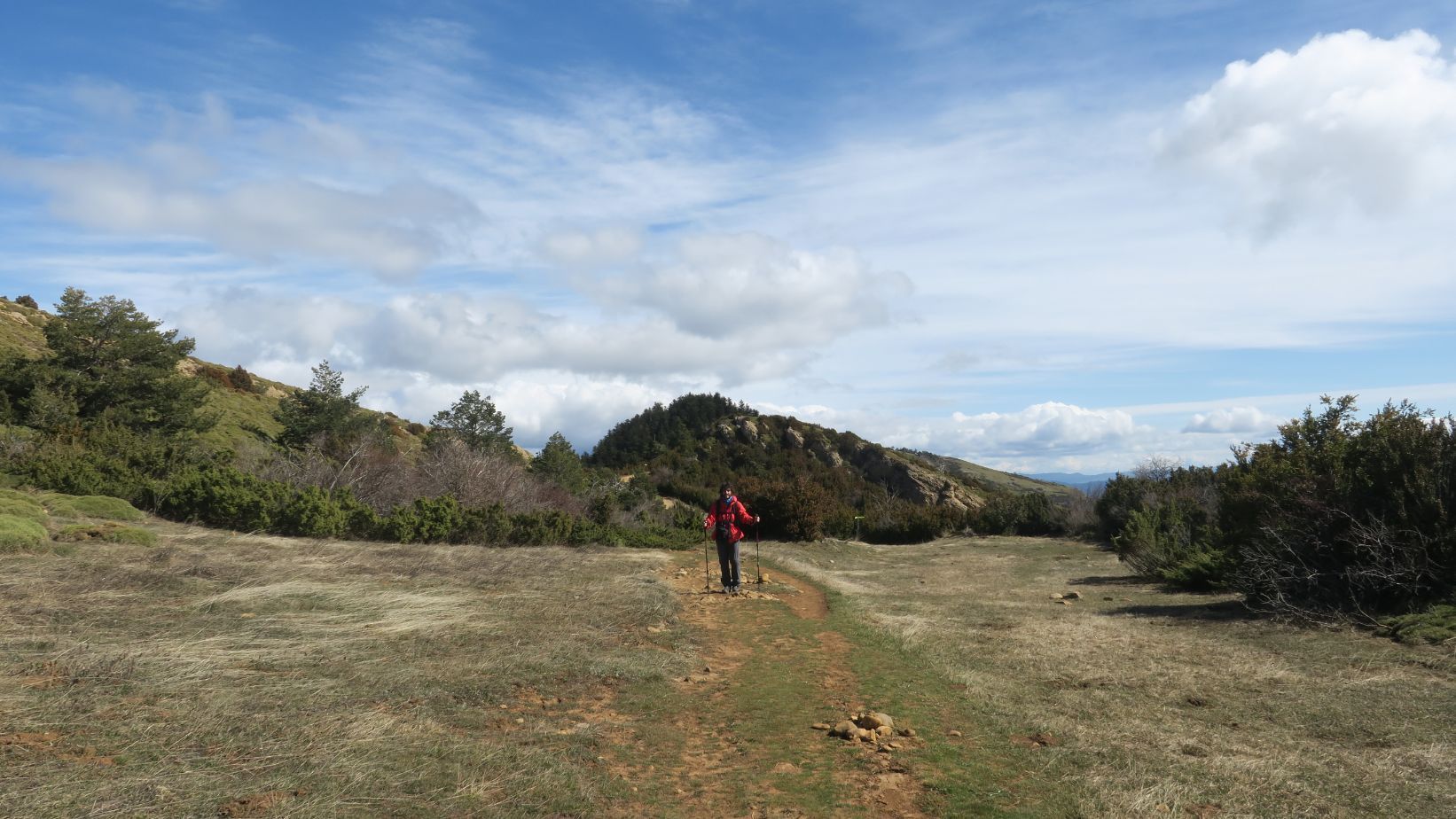 De este collado parten dos caminos, ambos válidos (ver foto). Si bien el de la derecha va más próximo a la cresta y es más directo, el de la izquierda desciende unos metros, pero es el camino principal. Tomamos, por tanto, este último.
