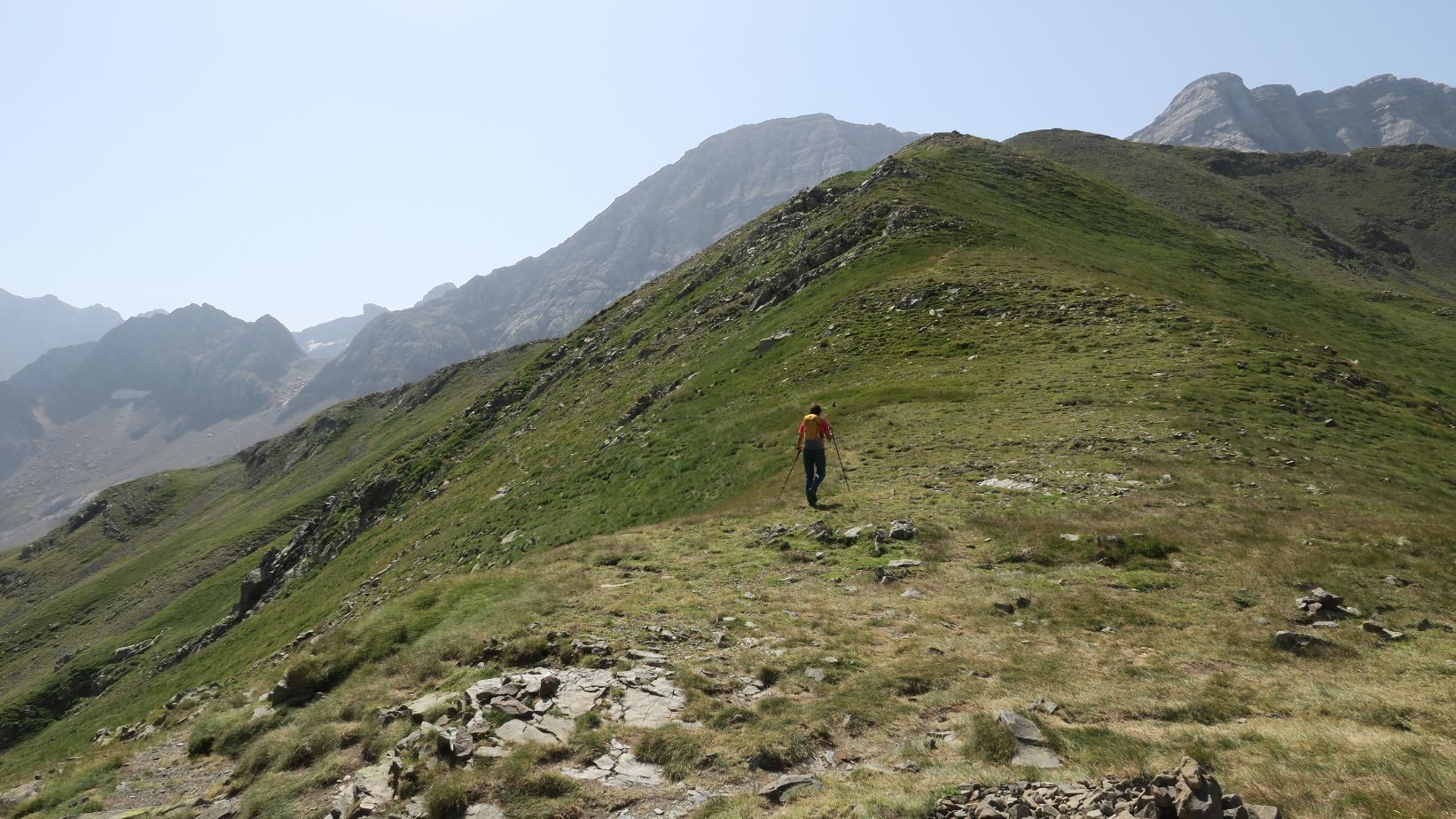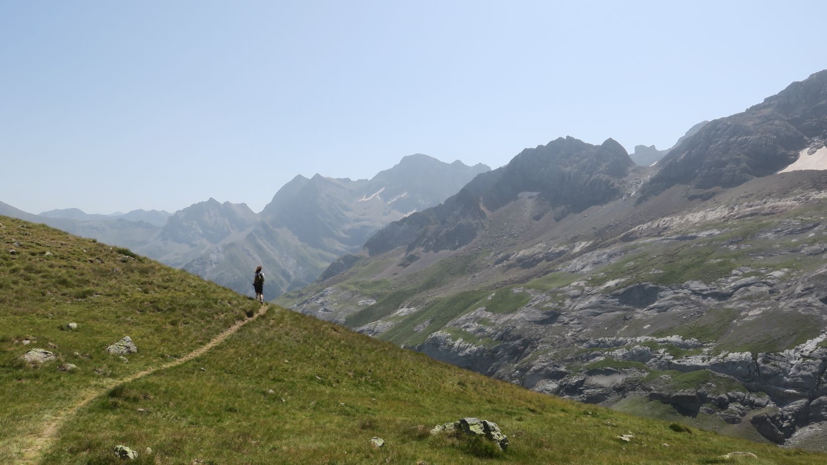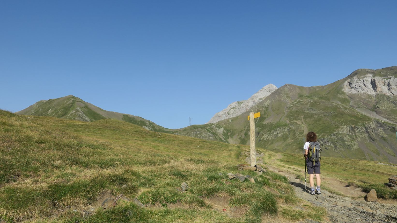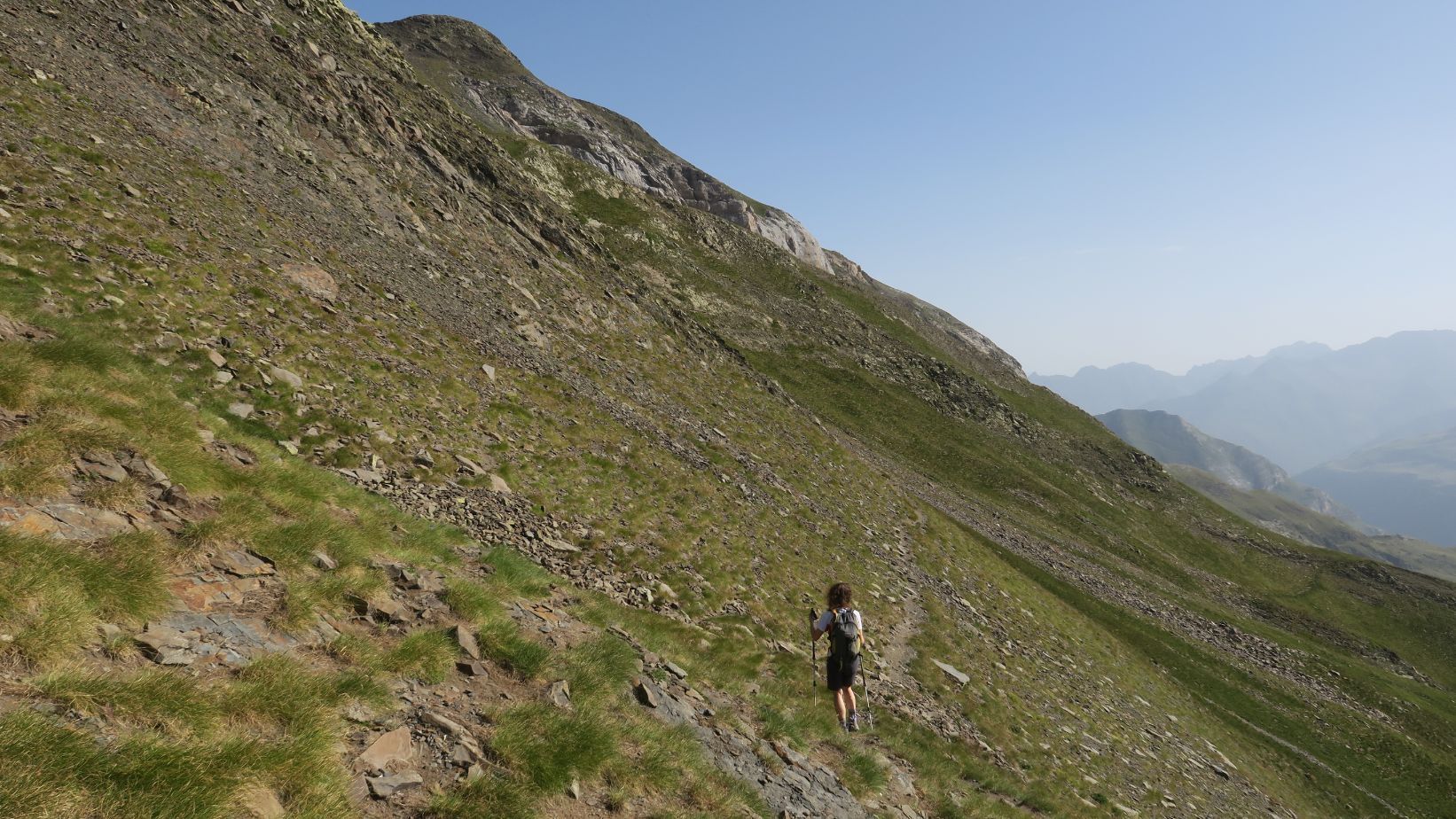 Aquí la senda vira hacia la derecha (norte), para continuar unos metros por encima de la línea fronteriza, hasta toparse con un desvío no señalizado. Si continuáramos rectos iríamos directos hacia el Soum Blanc des Espécières; nosotros tomamos el camino que parte hacia la derecha, descendiendo unos metros para flanquear la ladera herbosa en dirección norte, por un sendero estrecho pero bien pisado.