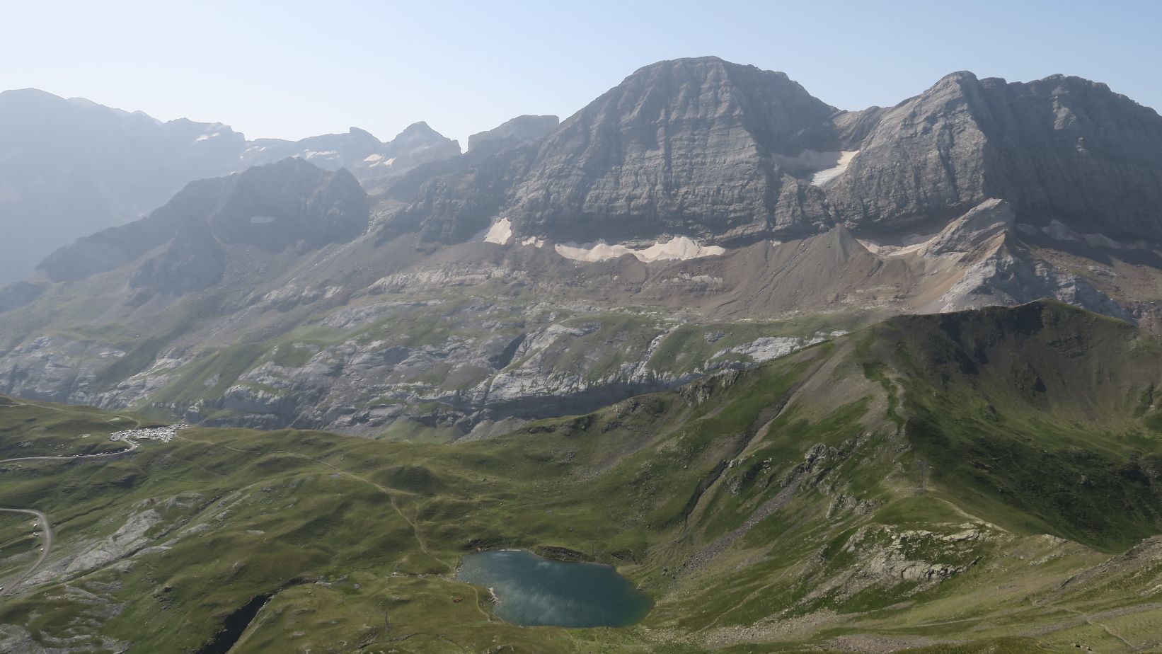 La cumbre cumple con lo que prometía: grandioso mirador en todas las direcciones. Pero, sobre todo, mirando hacia el sur, destaca la inmensa y altiva cara norte del Taillon. A dicha montaña le acompañan la Brecha de Rolando, la Torre, el Casco… e incluso asoma ligeramente la cima del Monte Perdido tras el Marboré. Hacia el norte destaca el Macizo de Vignemale, cuyo glaciar podemos contemplar parcialmente desde aquí. A nuestros pies, las aguas azules del Lac des Espécières.
