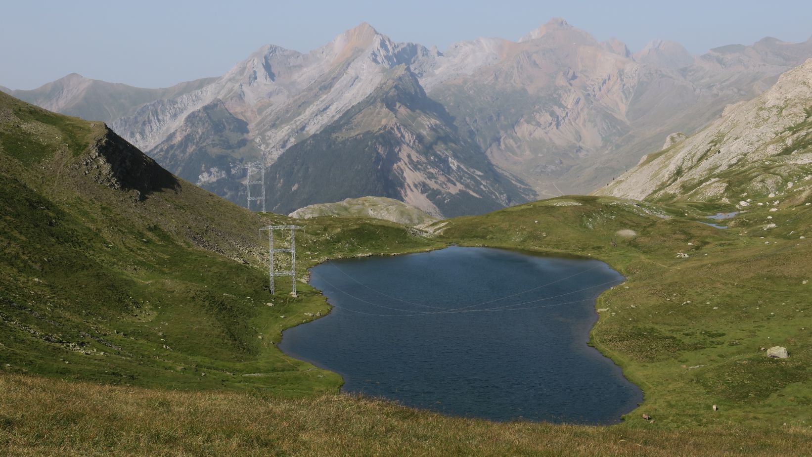 Enfrente tenemos ya el Col des Espécières/Puerto de Lapazosa, coronado por una gran torre metálica de alta tensión que, sin duda, resta belleza al entorno. El camino, cómodo hasta ahora, se torna más exigente, ascendiendo decidido hasta llegar a dicho puerto (1,5 km; 30 minutos; 2334 m). Desde aquí ganamos grandes vistas hacia el recóndito y no muy visitado Ibón de Lapazosa, con los picos Otal y Tendeñera de fondo. Bonita estampa.
