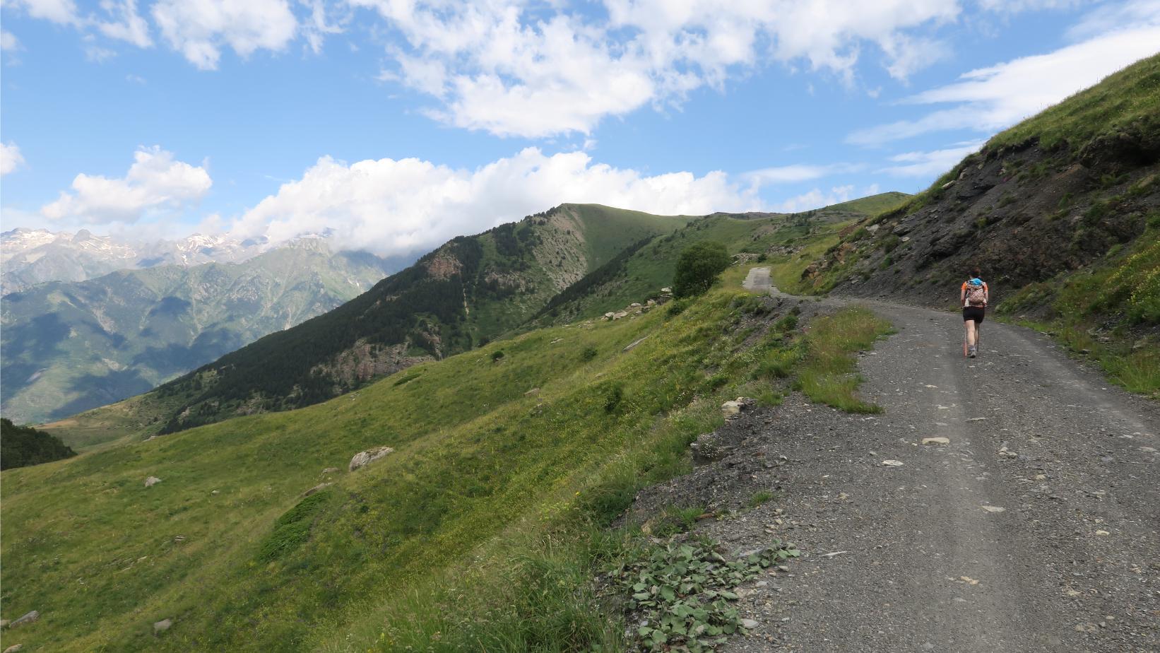 Inicialmente vamos remontando, cómodamente, la pista que se dirige rumbo noroeste, regalándonos ya las primeras panorámicas hacia la zona de Posets/Llardana. Tras la primera curva, podemos divisar nuestro objetivo del día: el Picalbo. Desde aquí muestra a la perfección su suave figura, modelada por amplias lomas verdes.