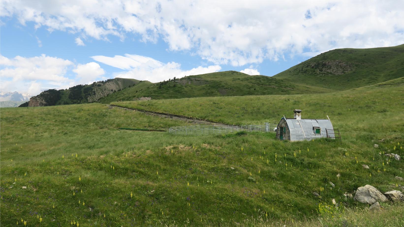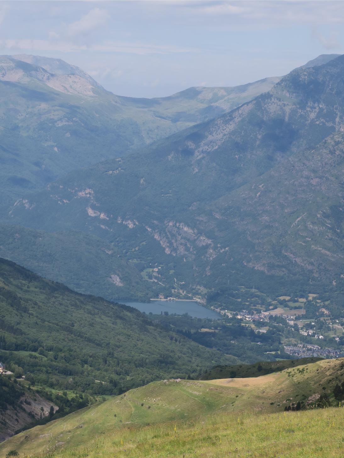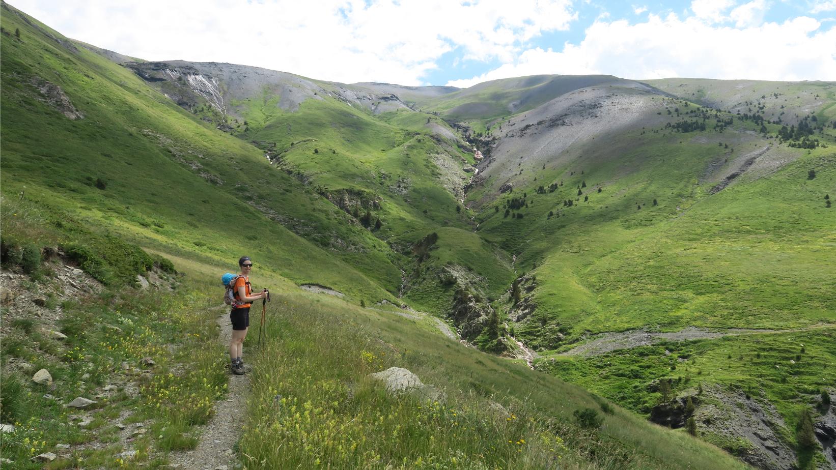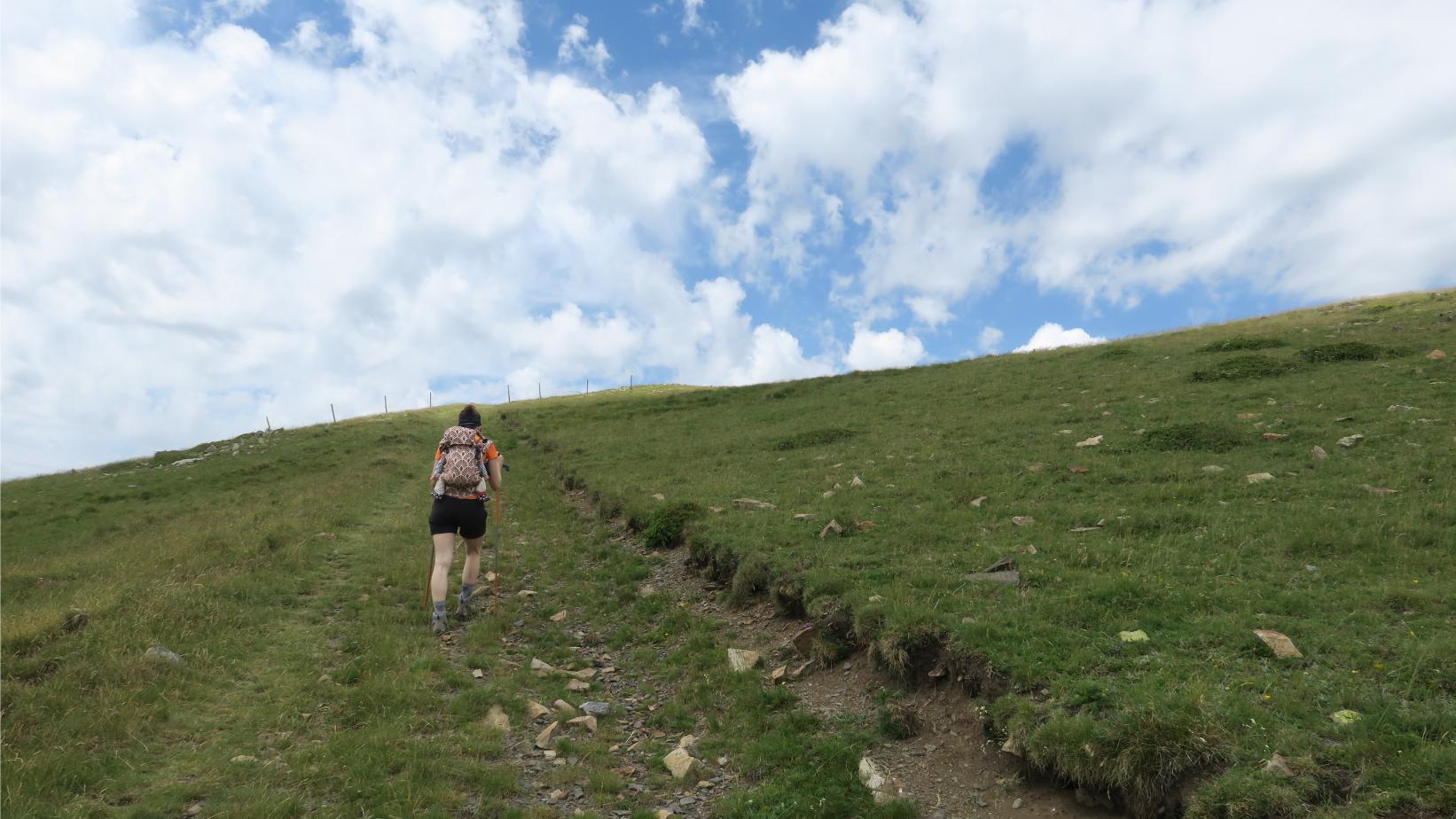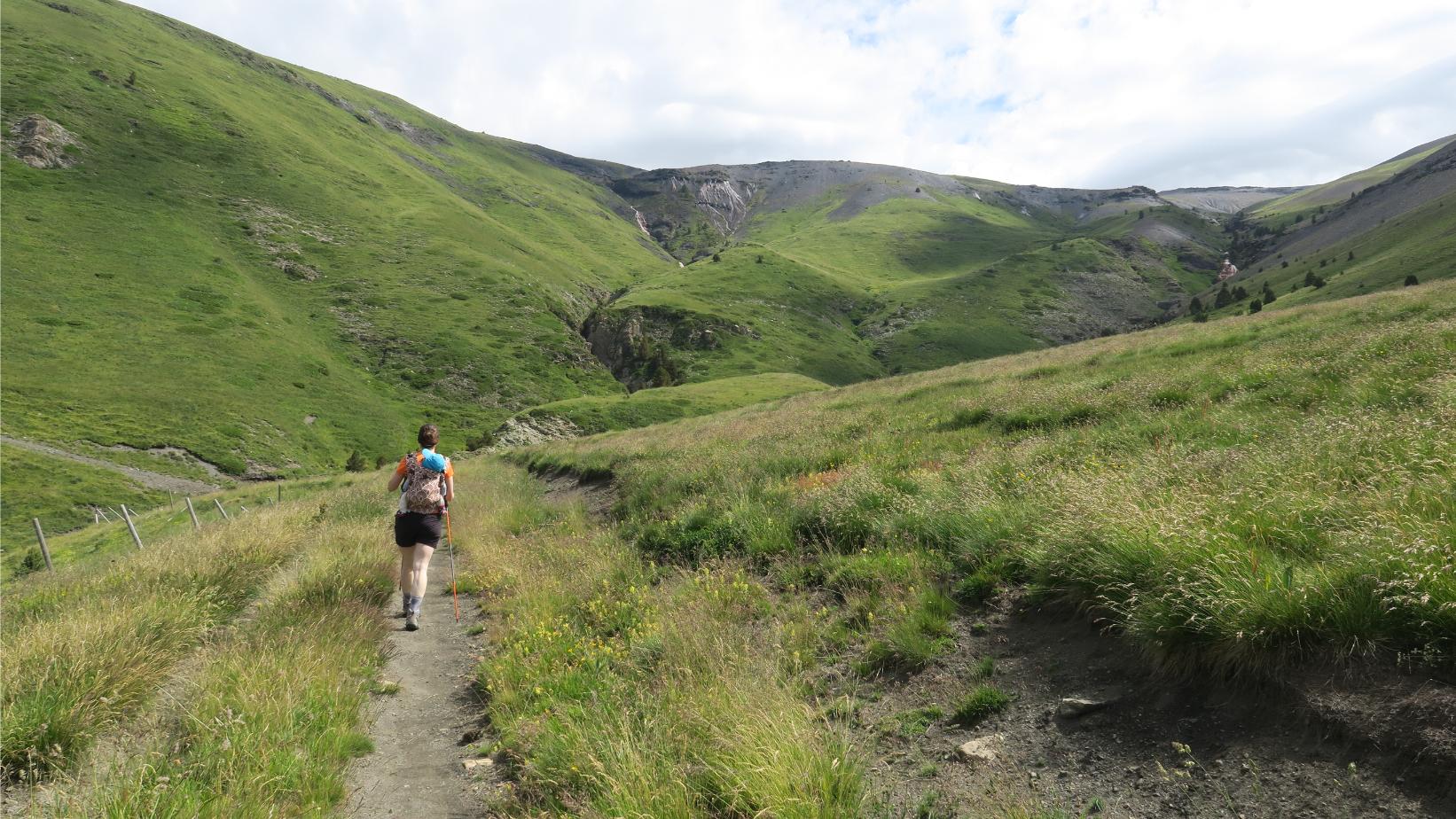 Si bien tras dicha cabaña la pista parece continuar unas decenas de metros, debemos advertir una senda a nuestra derecha, no señalizada y algo desdibujada por las hierbas que la reducen a su mínima expresión. En ascenso, y rumbo norte, va atravesando laderas herbosas mientras a nuestra izquierda divisamos ya una amplia panorámica, que abarca desde el Embalse de Linsoles (en el fondo del valle) al Collado de Sahún.