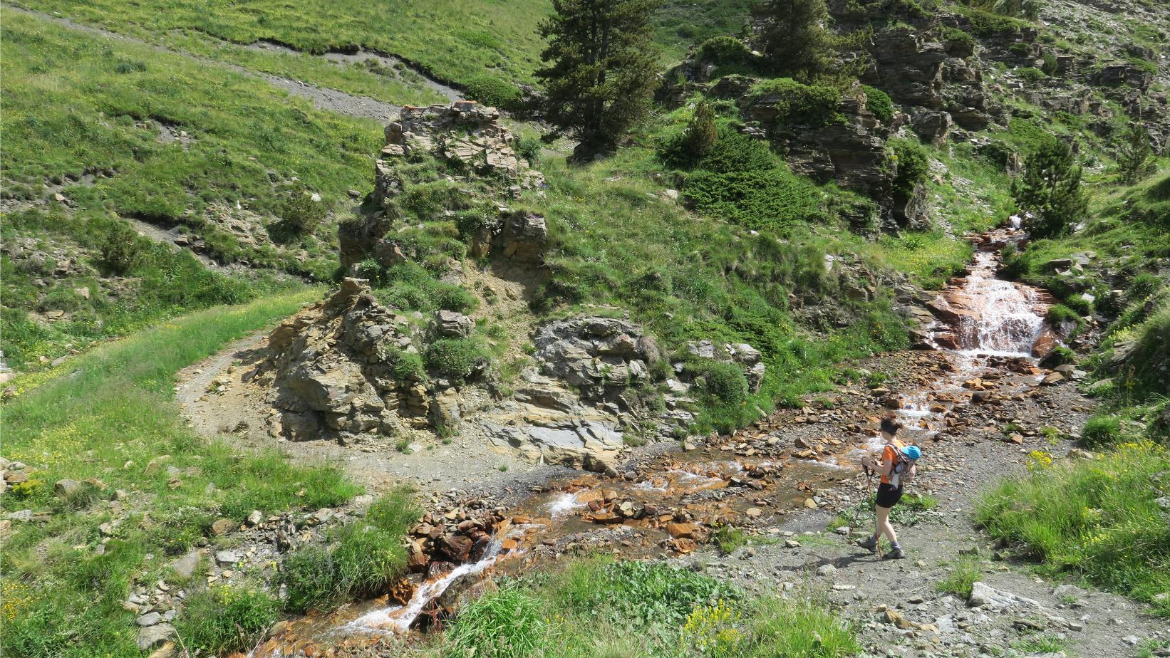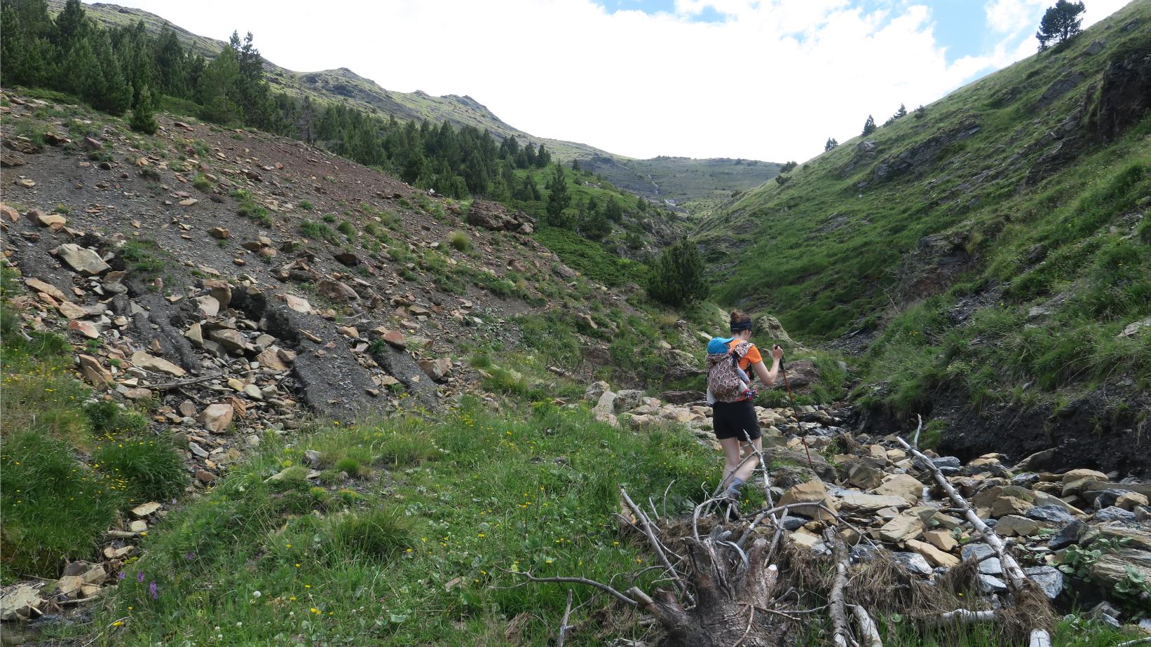 La senda, ahora ya más evidente, continúa rumbo norte descendiendo unos metros hasta alcanzar el Barranco del Clotet (1,65 km; 30 minutos, 2098 m). Baja poca agua, por lo cual resulta fácil atravesarlo.