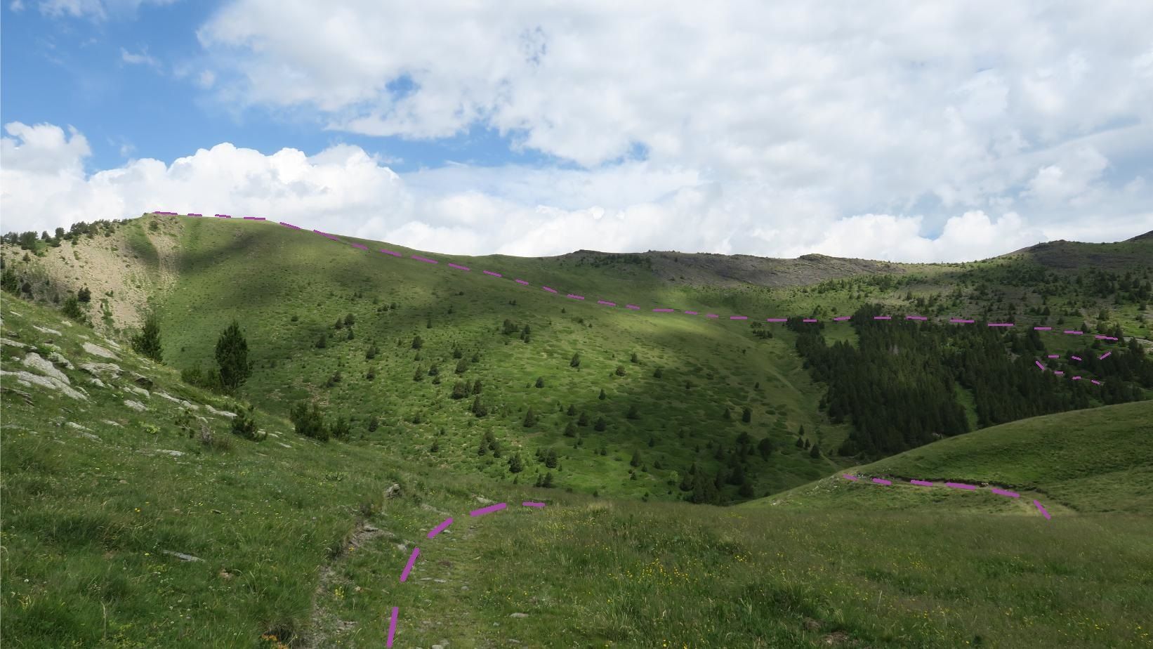 La pendiente suaviza y el camino vira progresivamente hacia el norte y, después, hacia el noreste mientras desciende, con la cima del Picalbo enfrente. Podemos visualizar, desde aquí, prácticamente todo el trayecto que nos queda hasta hollar su cima.