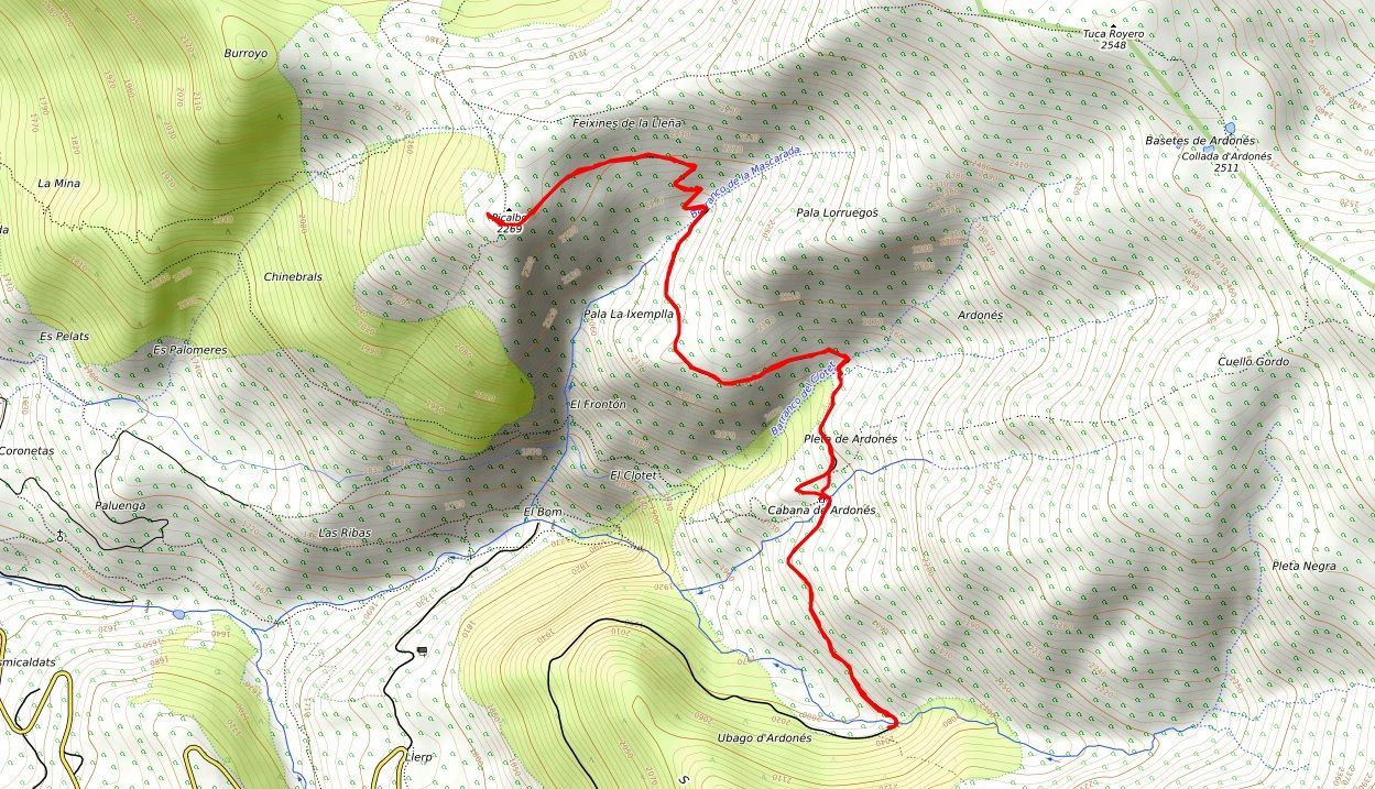 Itinerario: Barranco de l’Ubago – Cabaña de Ardonés – Barranco de Clotet – Barranco de la Mascarada – Picalbo – Barranco de la Mascarada – Barranco de Clotet – Cabaña de Ardonés – Barranco de l’Ubago.