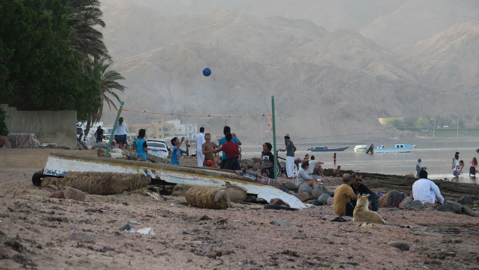 Leemos un rato junto a la playa situada frente al hotel, mientras vemos la vida cotidiana de los egipcios que juegan, conversan o pasean con las luces del atardecer.