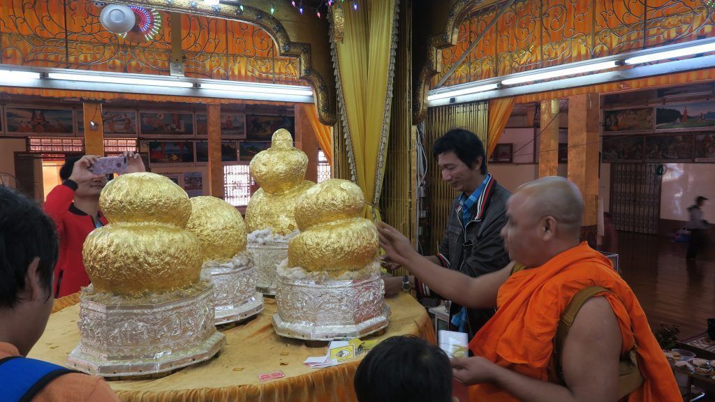 Nuestra primera parada es en la localidad de Ywama. Allí se encuentra la pagoda Phaung Daw Oo, que destaca desde la lejanía por su gran tamaño. Nos descalzamos y entramos, respetuosamente, a contemplar su interior. En él destacan cinco figuras de Buda sobre las cuales los fervientes locales colocan láminas de pan de oro. Tras centenares (¿miles? ¿decenas de miles?) de capas de pan de oro las figuras de Buda se han convertido en unas masas amorfas que apenas recuerdan su forma original. Numerosas familias visitan la pagoda, mezcladas con un pequeño puñado de turistas.
