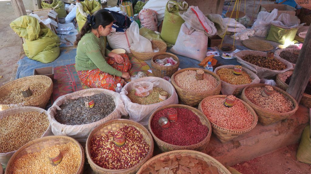A la salida de la pagoda encontramos un mercado bastante ajetreado, en el que se vende fruta, carne, pescado, ropa y todo tipo de utensilios. Como ocurre siempre, no podemos evitar recorrerlo prestando atención a todos los detalles.