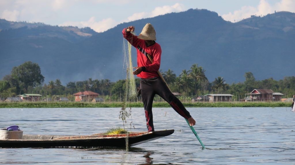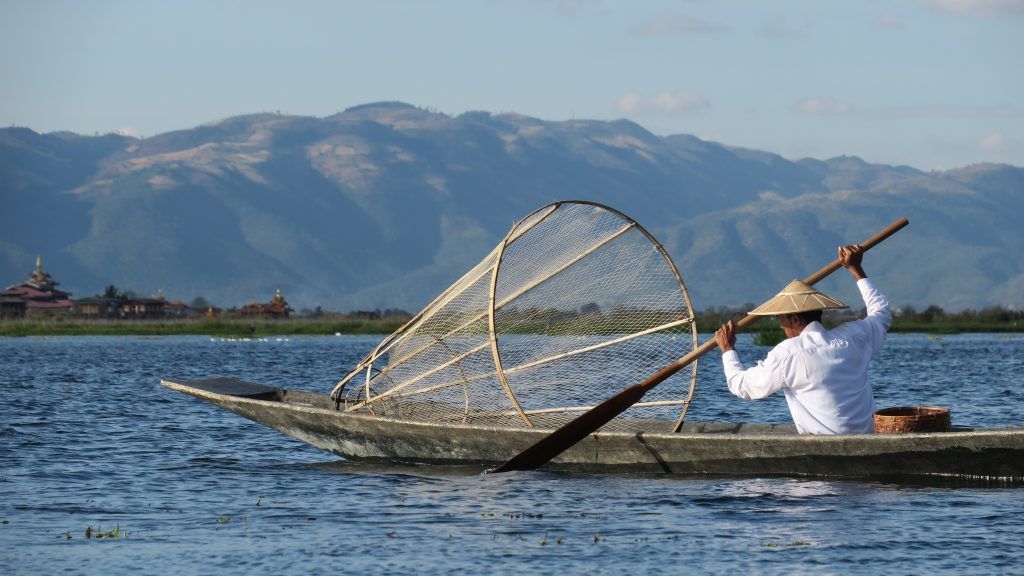Pescadores del Lago Inle: en el Lago Inle los pescadores suelen remar de la manera tradicional, acompañando el remo con una de sus piernas mientras utilizan los brazos para mover grandes cestas. Es habitual que modernos “pescadores”, ataviados con pulcros y vistosos ropajes y cestas se acerquen a las barcas de turistas y realicen poses llamativas, para que estos puedan tomar fotografías. Lo que buscan, realmente, es pescar alguna propina. Sin embargo, es sencillo (hablando con el dueño de la barca que nos lleva) moverse a alguna zona en la que los pescadores reales estén faenando tranquilamente (aunque con menos “glamour”) y poder contemplarlos en acción.