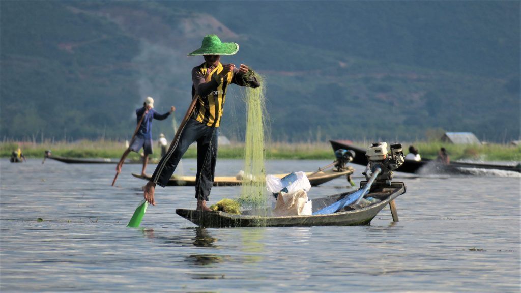 Nos alejamos de allí hasta una zona en la que, por fin, vemos a pescadores en plena faena. Con ropa normal y corriente y redes antiguas, probablemente con mil remiendos, prueban fortuna en la búsqueda de peces. Efectivamente, se ayudan de una de sus piernas para remar, de manera que tienen las manos libres para lanzar o recoger las redes.