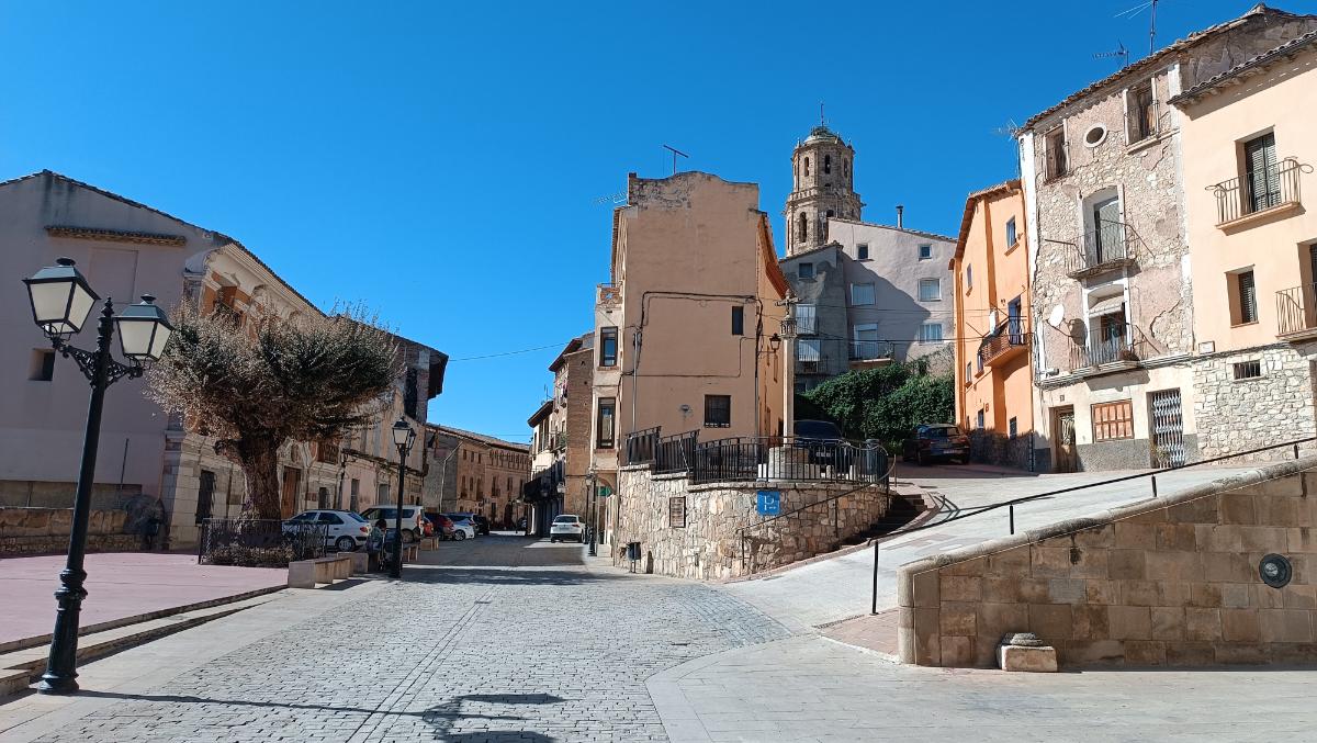 Echamos un vistazo atrás para contemplar la plaza desde otra perspectiva, destacando en lo alto la torre de la iglesia. Optamos, ahora, por ascender por una estrecha calle y pasar bajo el arco que forma la Casa Codera, para posteriormente adentrarnos en la Calle la Forza, que lleva a la parte alta de la población. Desde allí gozamos de unas vastas panorámicas de la comarca y, a lo lejos, la siempre reconocible silueta del Tozal de Guara.