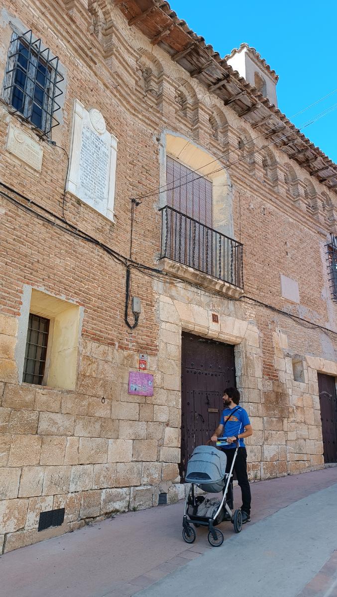 Contemplando la Casa Moner, donde nació Pedro Cerbuna, fundador de la Universidad de Zaragoza.