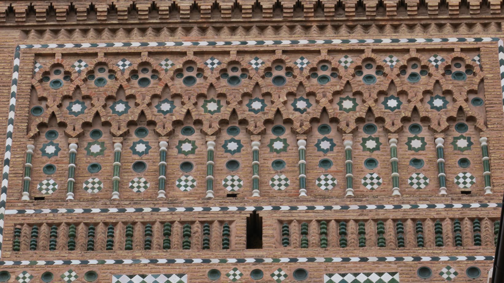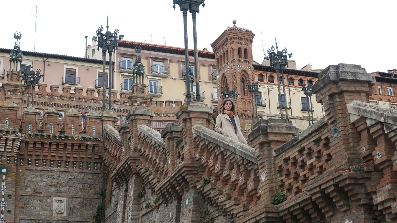 Dejamos todo en nuestro alojamiento y paseamos por el viaducto y el Paseo del Óvalo hasta llegar a la Escalinata del Óvalo. La descendemos y contemplamos su decoración, de estilo neomudéjar y en la que destaca, además, la escultura de una escena de los Amantes de Teruel. Característicos ladrillos y cerámica verde y blanca conforman la imponente escalinata.