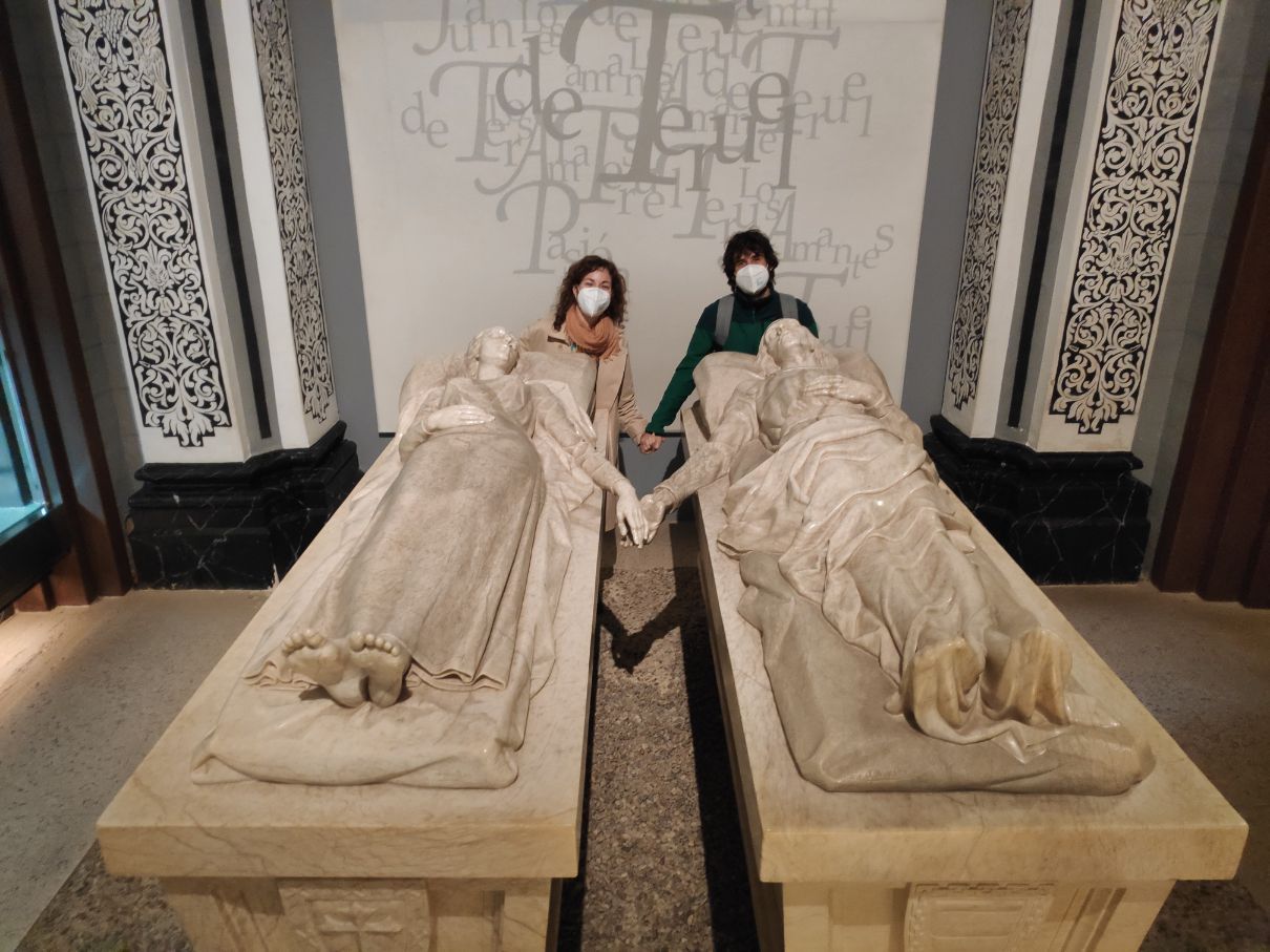 Finalizamos la visita fotografiándonos con las esculturas de los Amantes de Teruel, personajes más célebres de la ciudad.