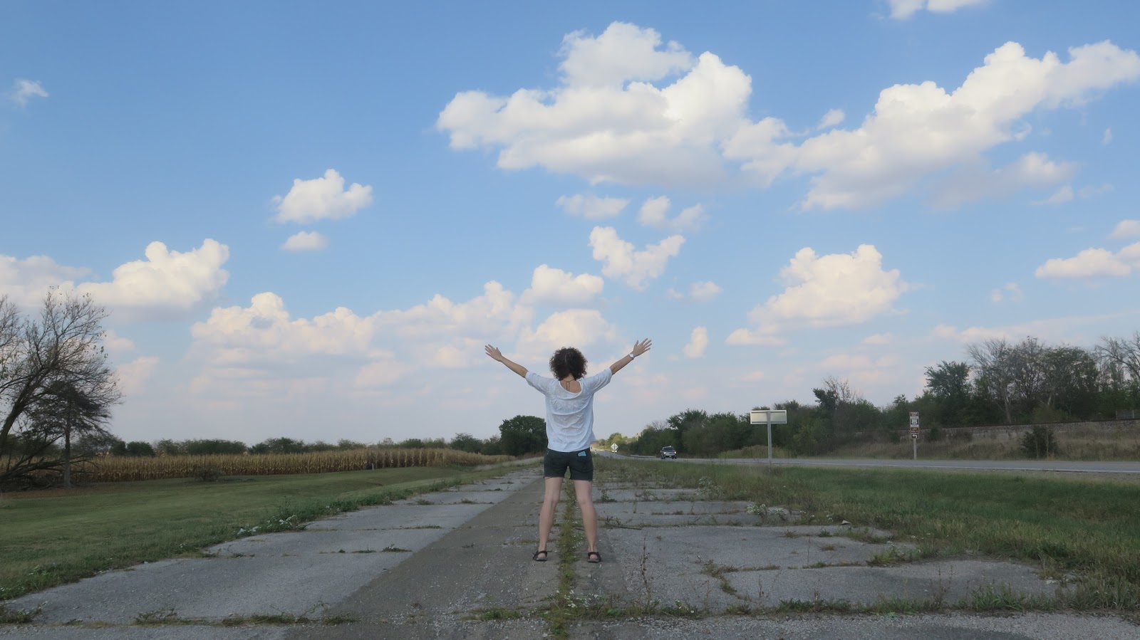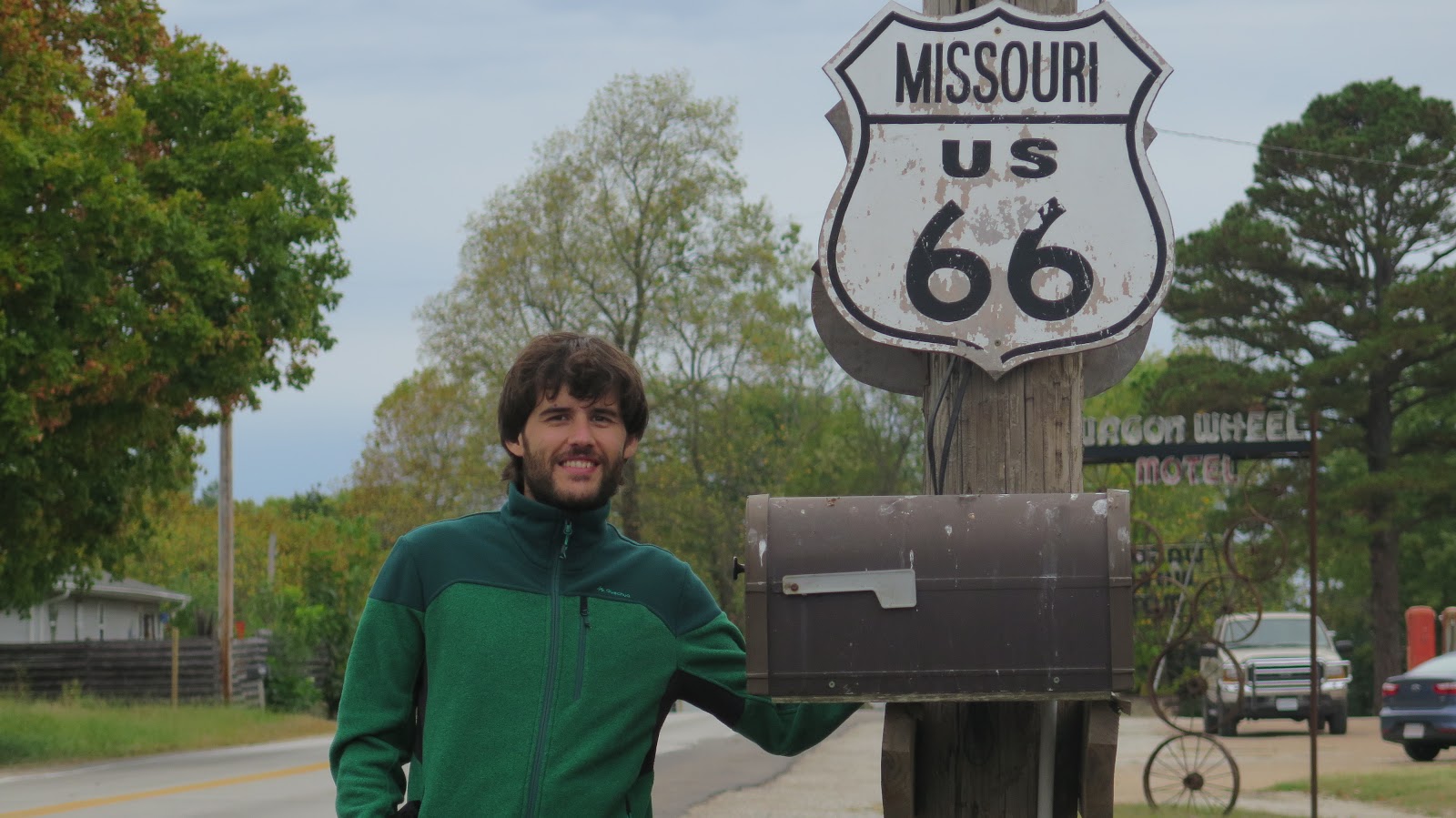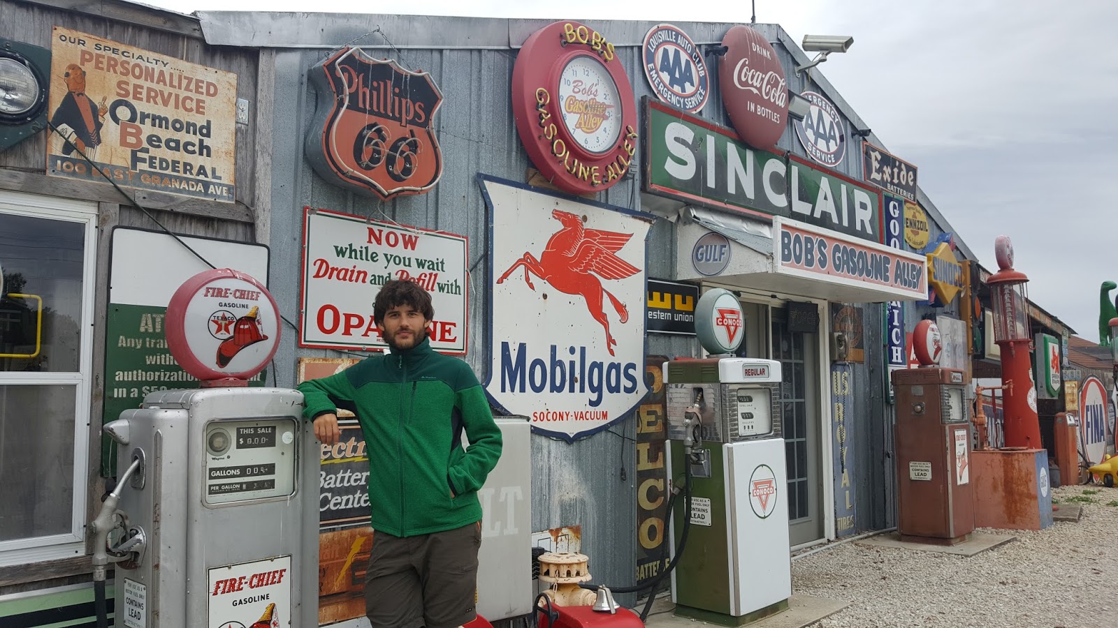 Posando en la entrada de uno de los museos de la Ruta 66. El cartel se ve a lo lejos, sin duda.