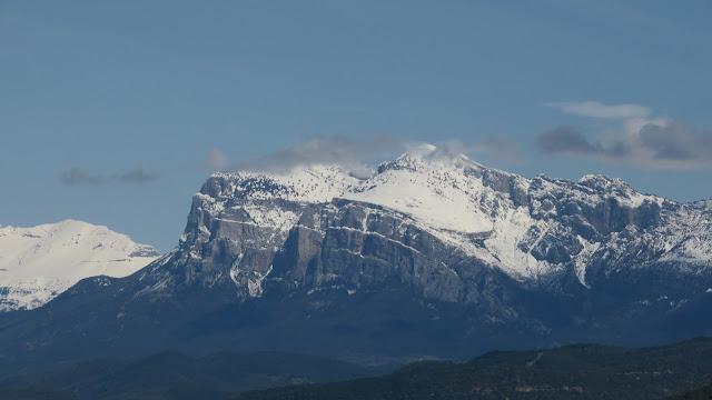Paso a paso nos elevamos sobre las llanuras del Sobrarbe, dejando la localidad de Samitier a nuestros pies. La vista se va ampliando y comenzamos a ver las nevadas cimas de algunos colosos del Pirineo, a cuyas cimas parecen aferrarse con fuerza las nubes.